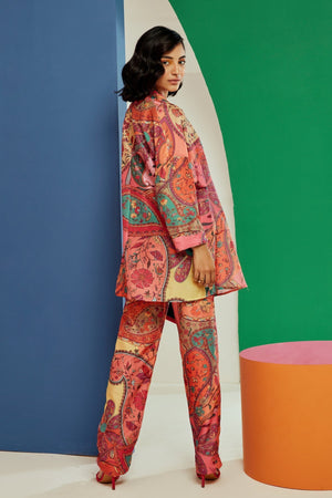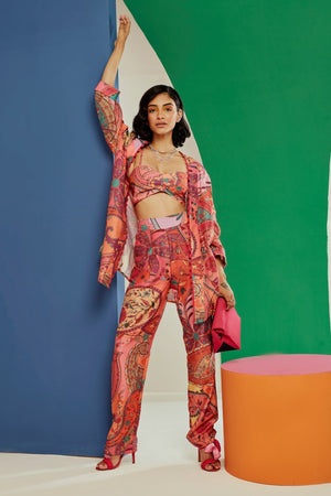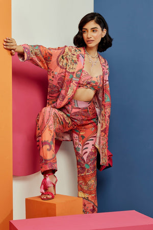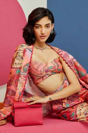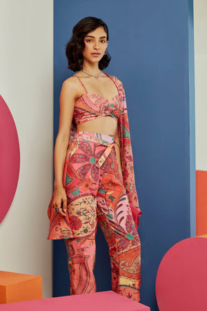 • Multicoloured printed cape and bustirer paired with pants and tie up belt