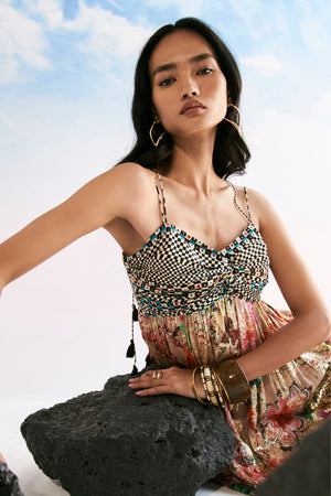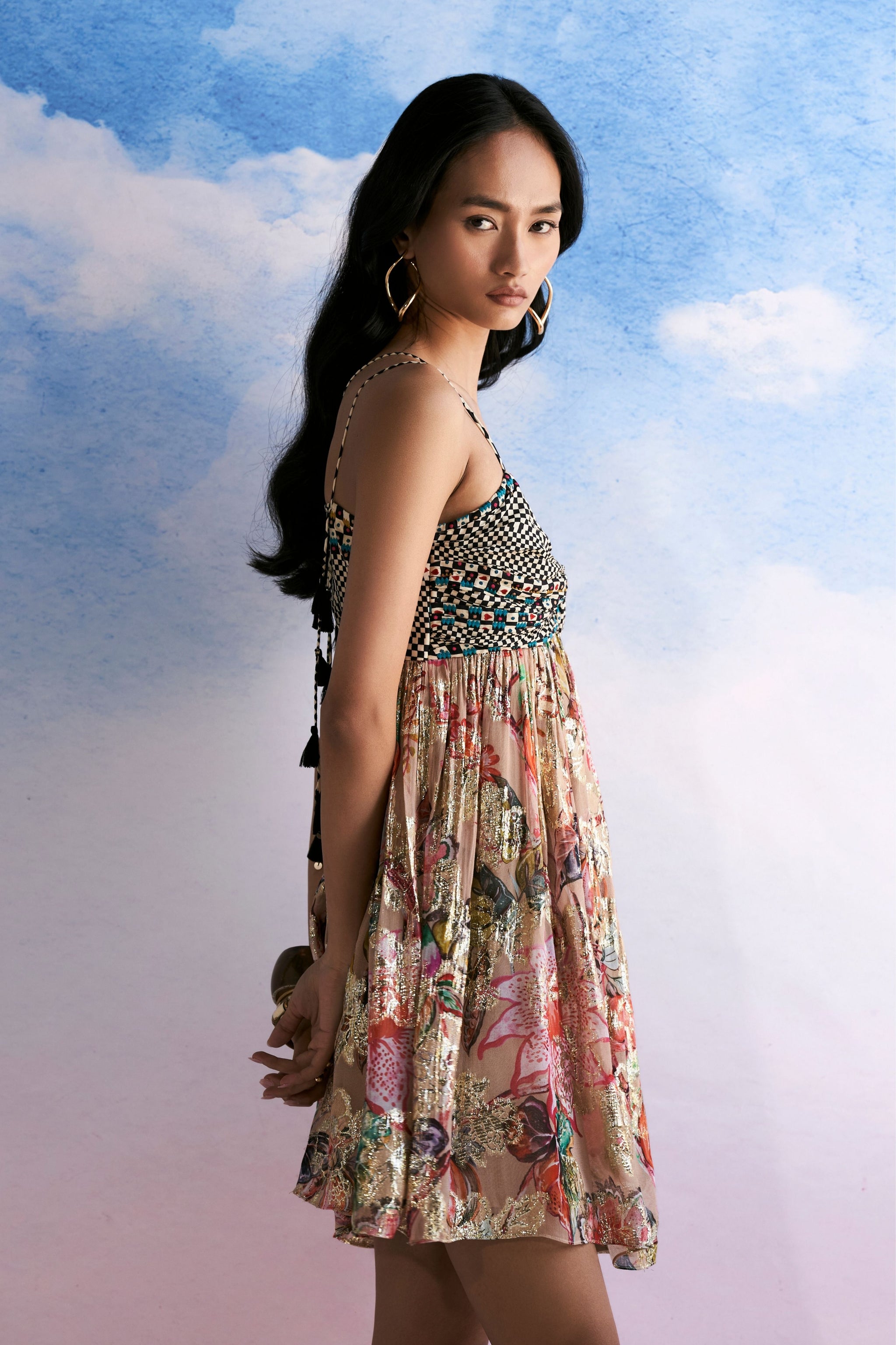 • Our lily mini in a radiant new twist ,peach florals with a checked embroidered torso .