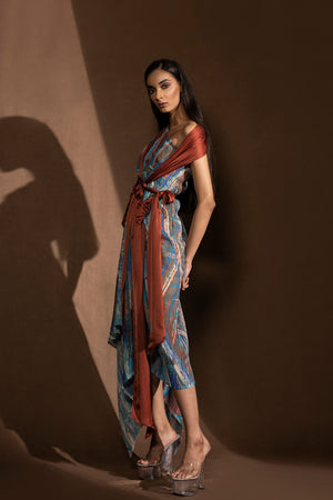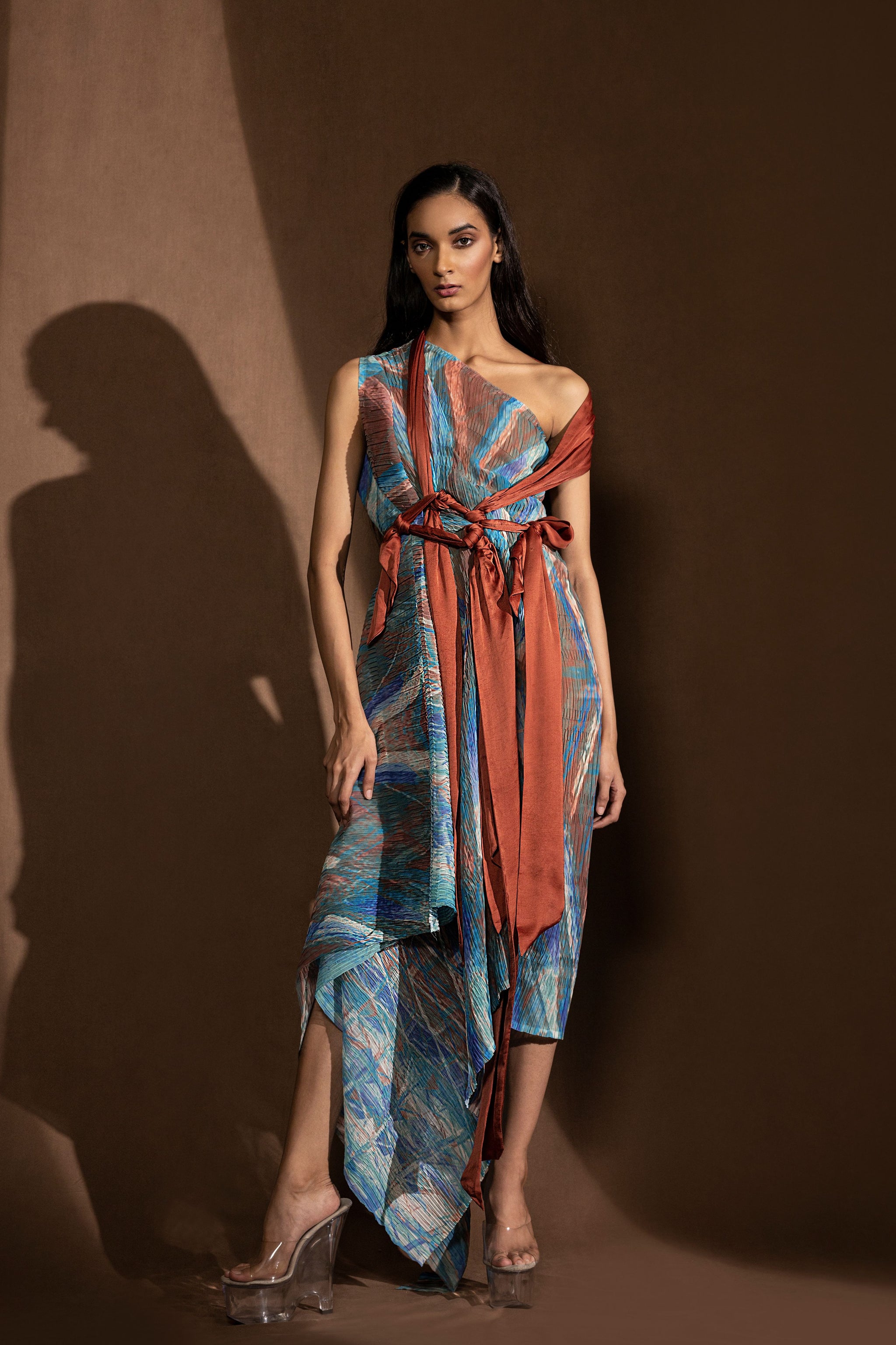 • Asymmetrical One-off-shoulder Draped Dress Accented With Satin Sashes Draped To Give An Interesting Look.