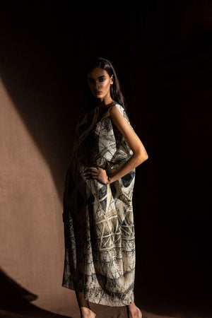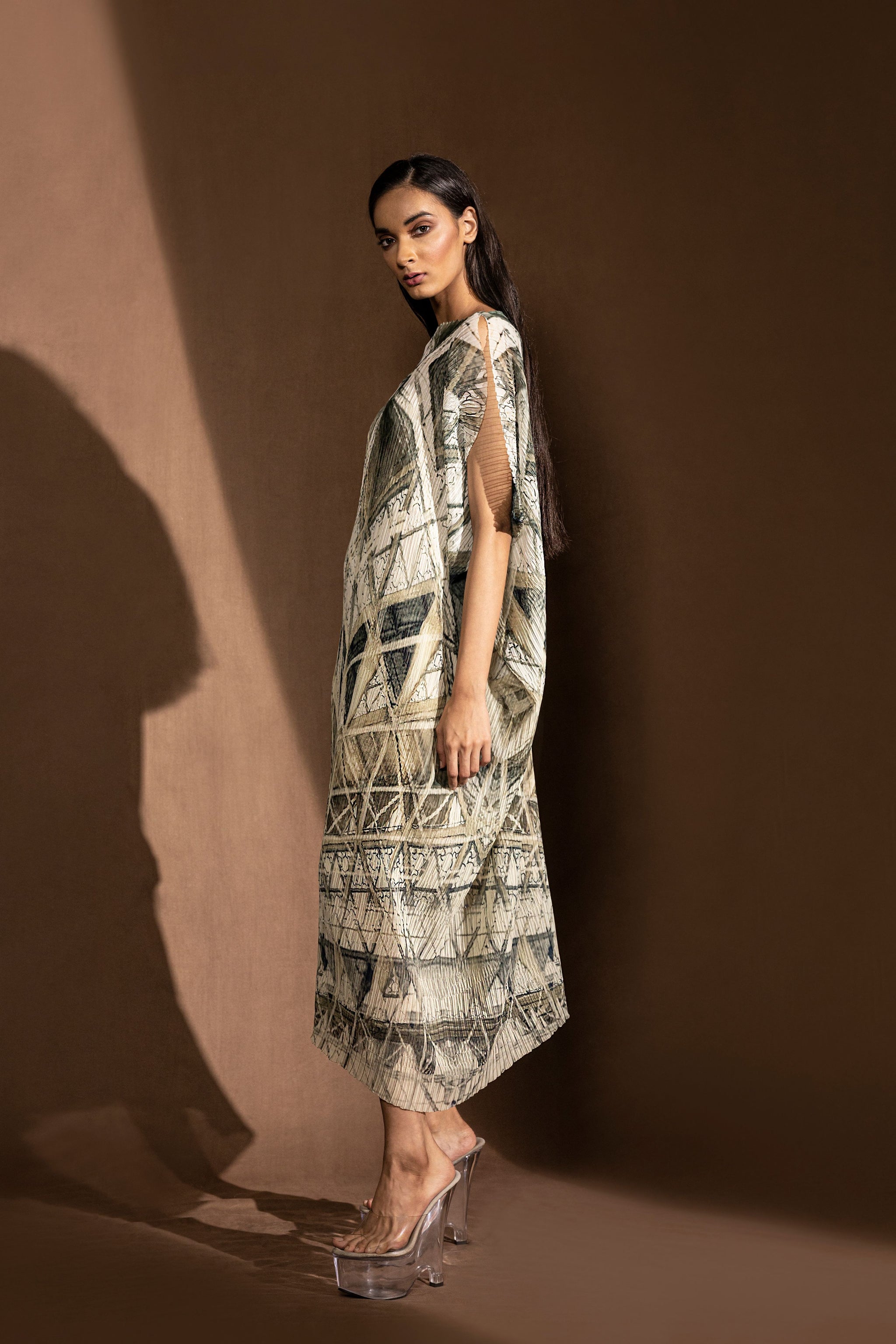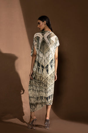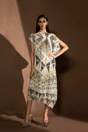 • Overlap Shoulder Printed Draped Dress With Geometrical Print Pattern.