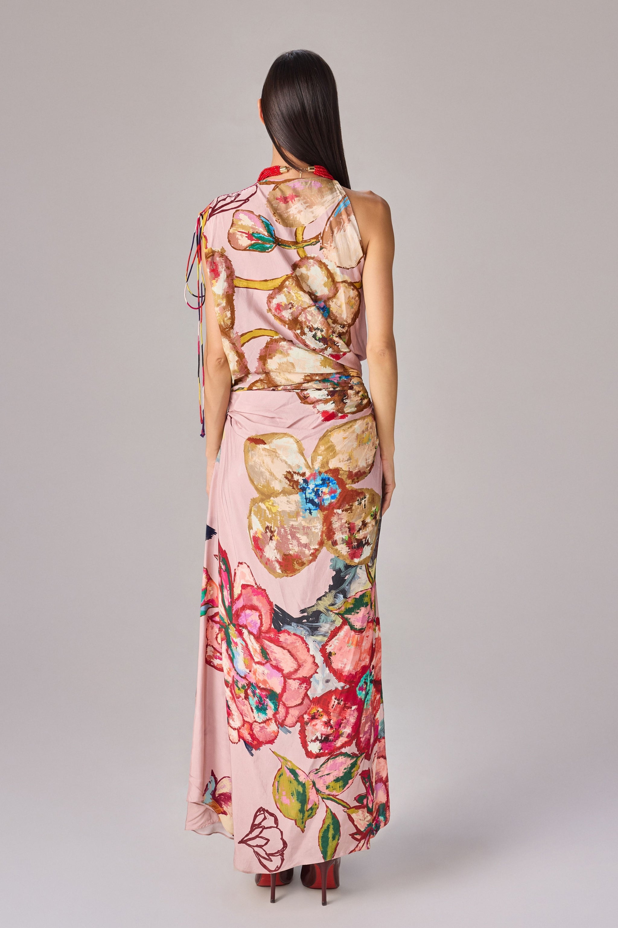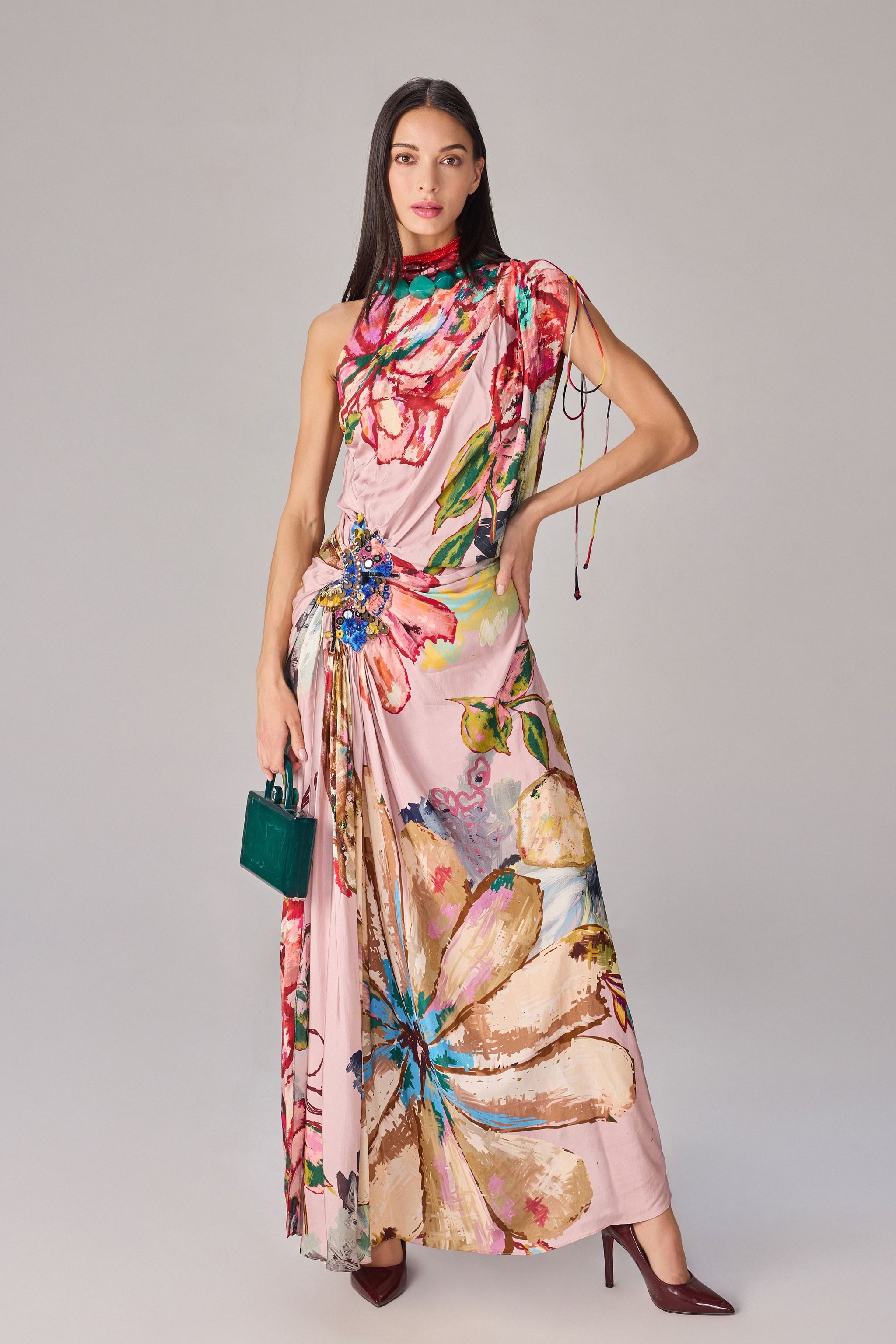 • Floral print maxi dress with one shoulder detailing, side ruching, intricate mirror, coin and tassel hand embroidered side design and customisable side slit