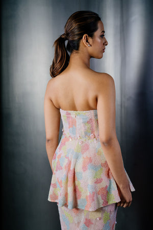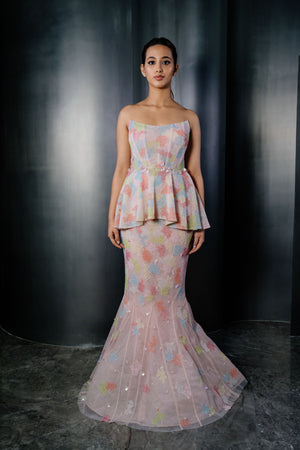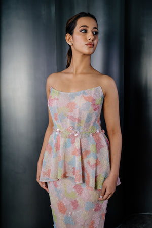 • This gradient corset style peplum top features multi colour gitch embroidery on a tulle base, beautifully paired with a fishtail skirt in a tulle base with multi colour gitch embroidery.