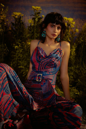 • A cowl neck dress with high slit adding a touch of allure. The dress is paired with a adjustable fabric belt