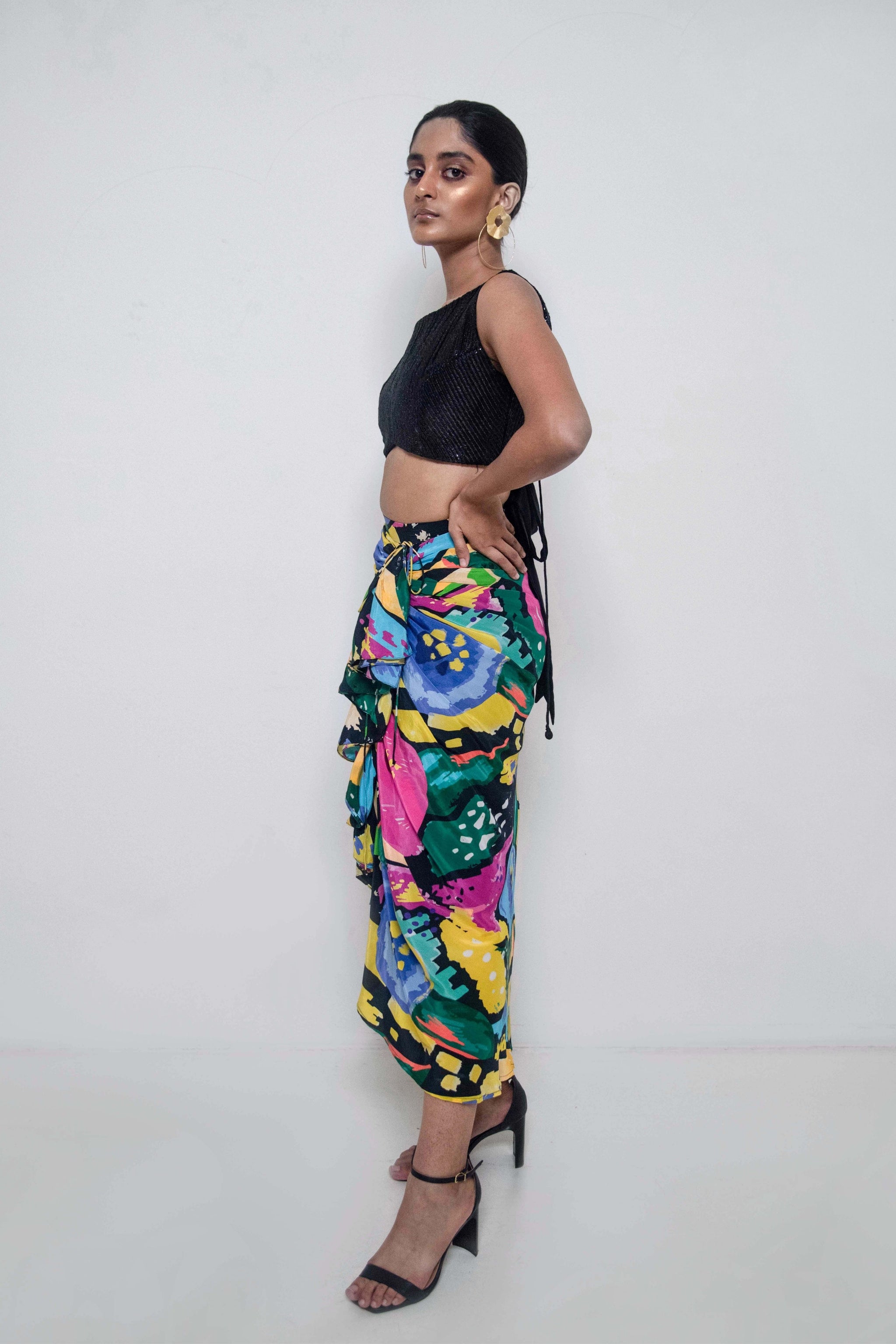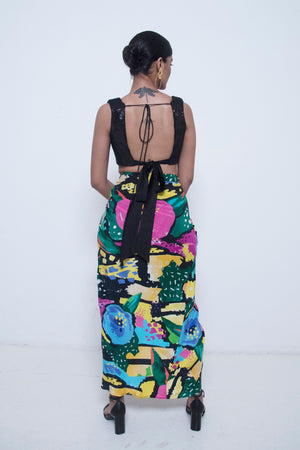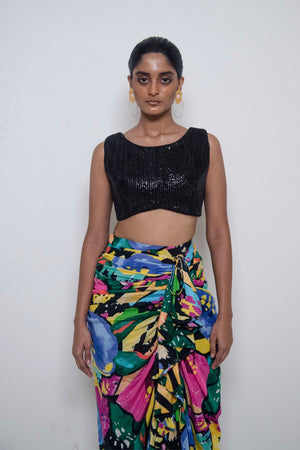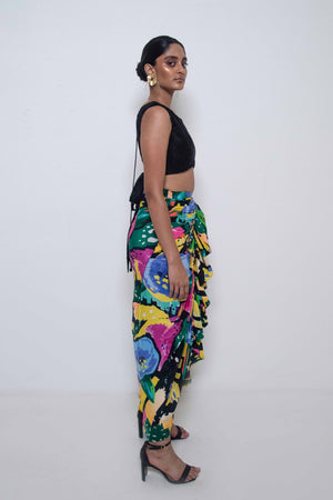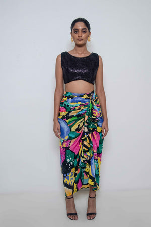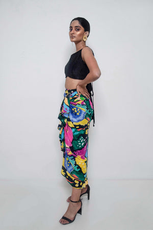 • Abstract floral printed draped and ruffle detailing skirt teamed with embroidered textured sleeveless top