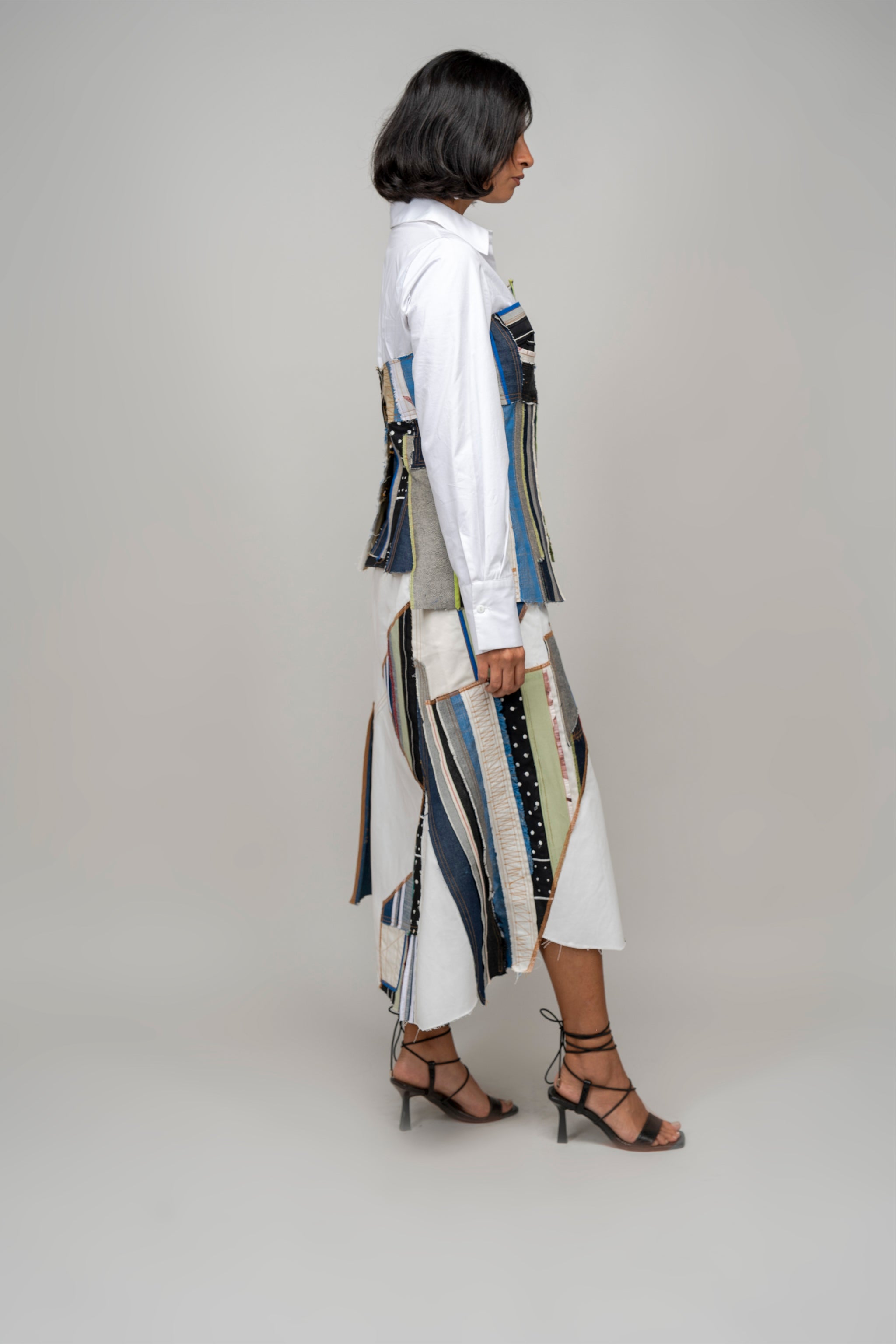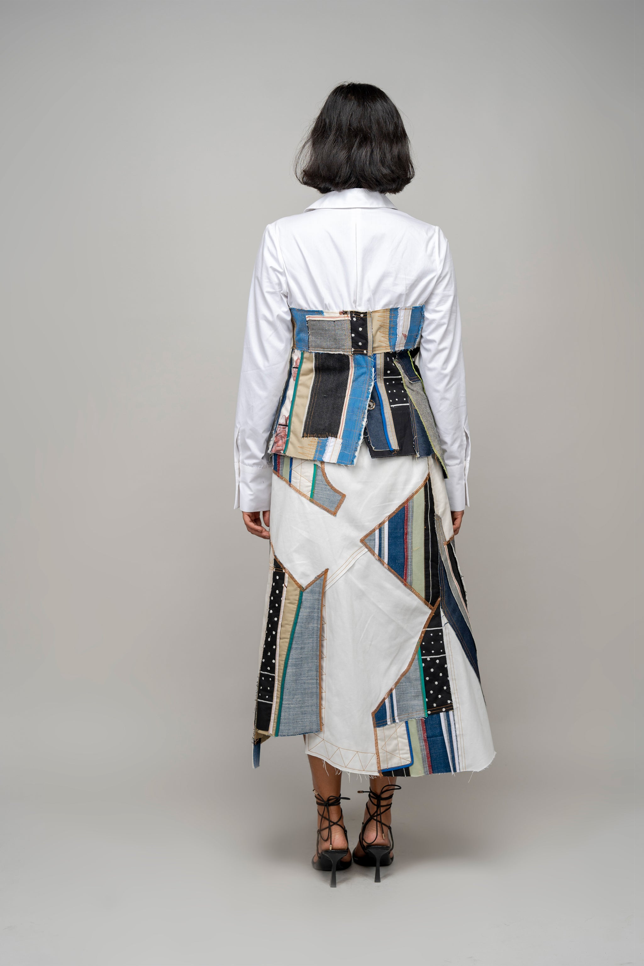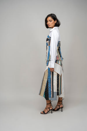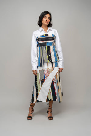 • This repurposed skirt is a patchwork of textiles assembled in blocks and panels from leftover of past collections. It features an asymmetrical hemline, a fly opening and side pockets. Model wear size m model height is 5'8 garment length is 32''