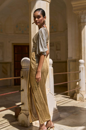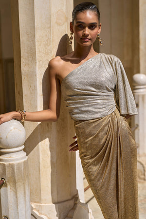 • One shoulder draped dress in colour blocked foil printed drapey knit fabric. Semi-elasticated at the waist to create a flowing draped silhouette. Slit till the knee. Soft gathering on the side seam to create a structured drape. Garment is lined.