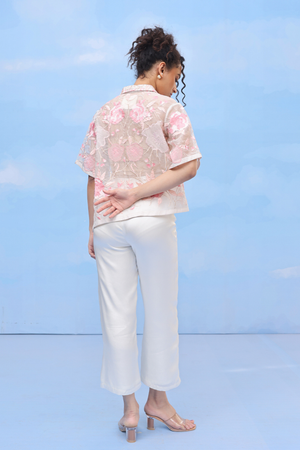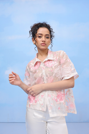 • Embellished with flower applique embroidery on silk organza. This oversized shirt features a diagonal cut hem, eton collar, bell sleeves, creating an elegant and chic silhouette.