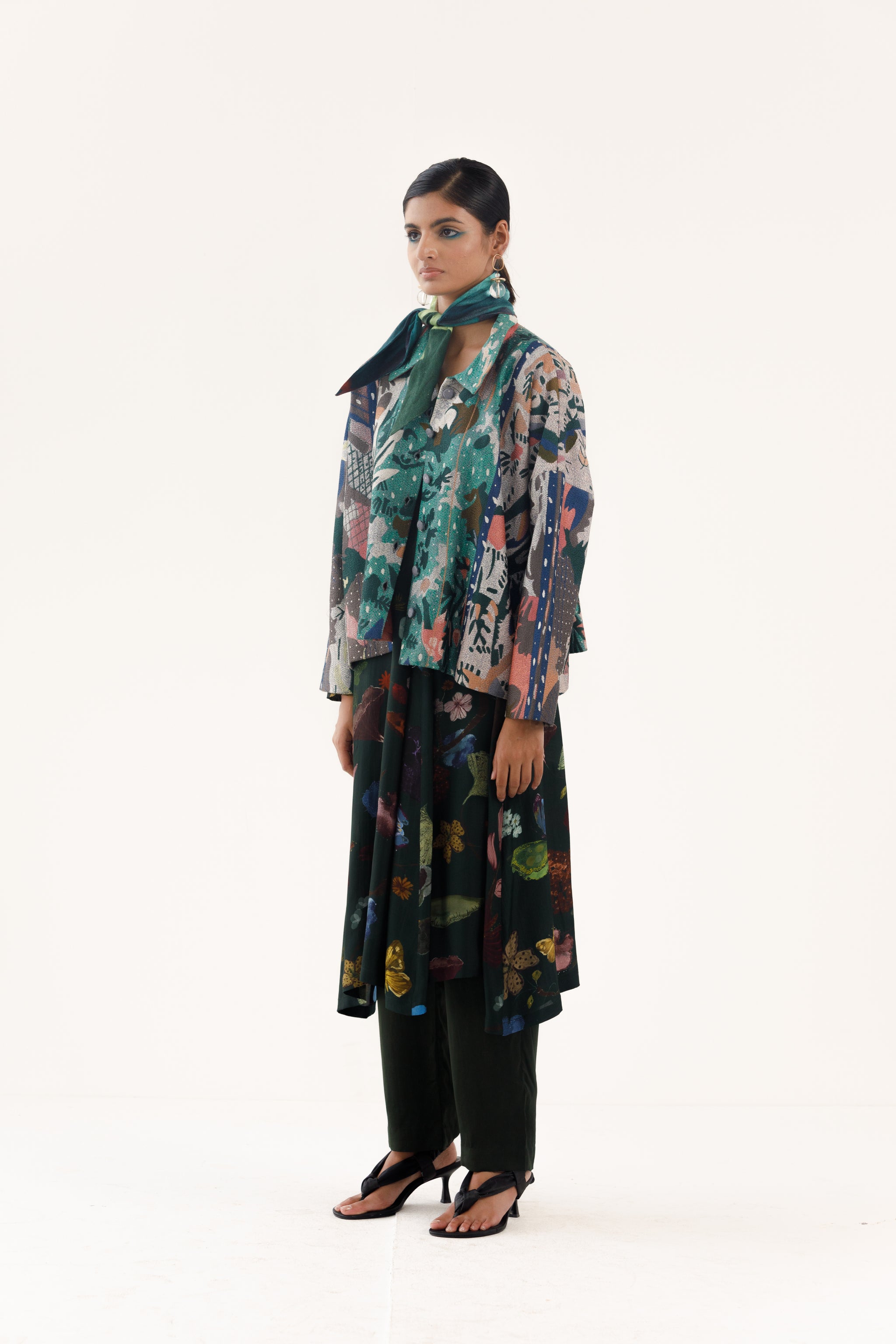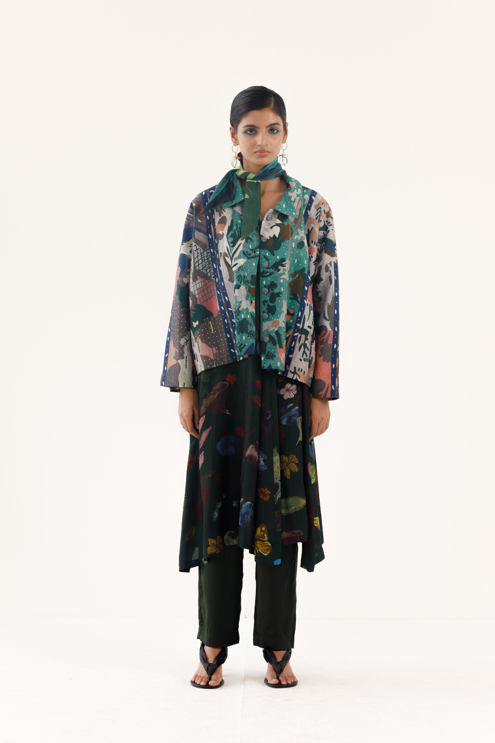 • All over handcrafted one thread embroidery jacket is a piece of wearable art. This timeless jacket takes over 30 days to embroider and has side pockets and a polka dot block printed lining on the inside. Dress to impress.