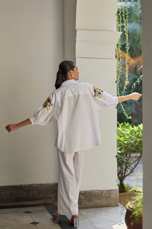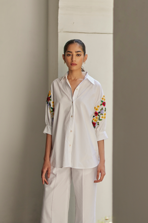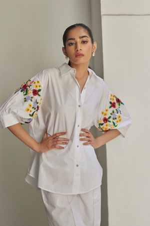 • A crisp white shirt beautiful hand embroidery made with detailed multicoloured sequins flowers. Who can so no, to that in summer season. A beautiful addition to a classic. This relaxed style shirt is perfect for all shapes sizes and ages. Wear it over plain white pants or denims or your summer short, this shirt can be worn in multiples ways.