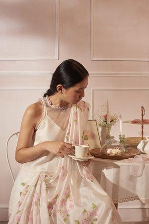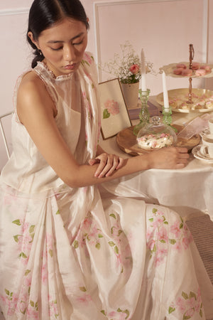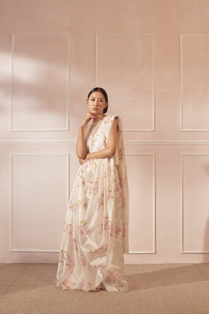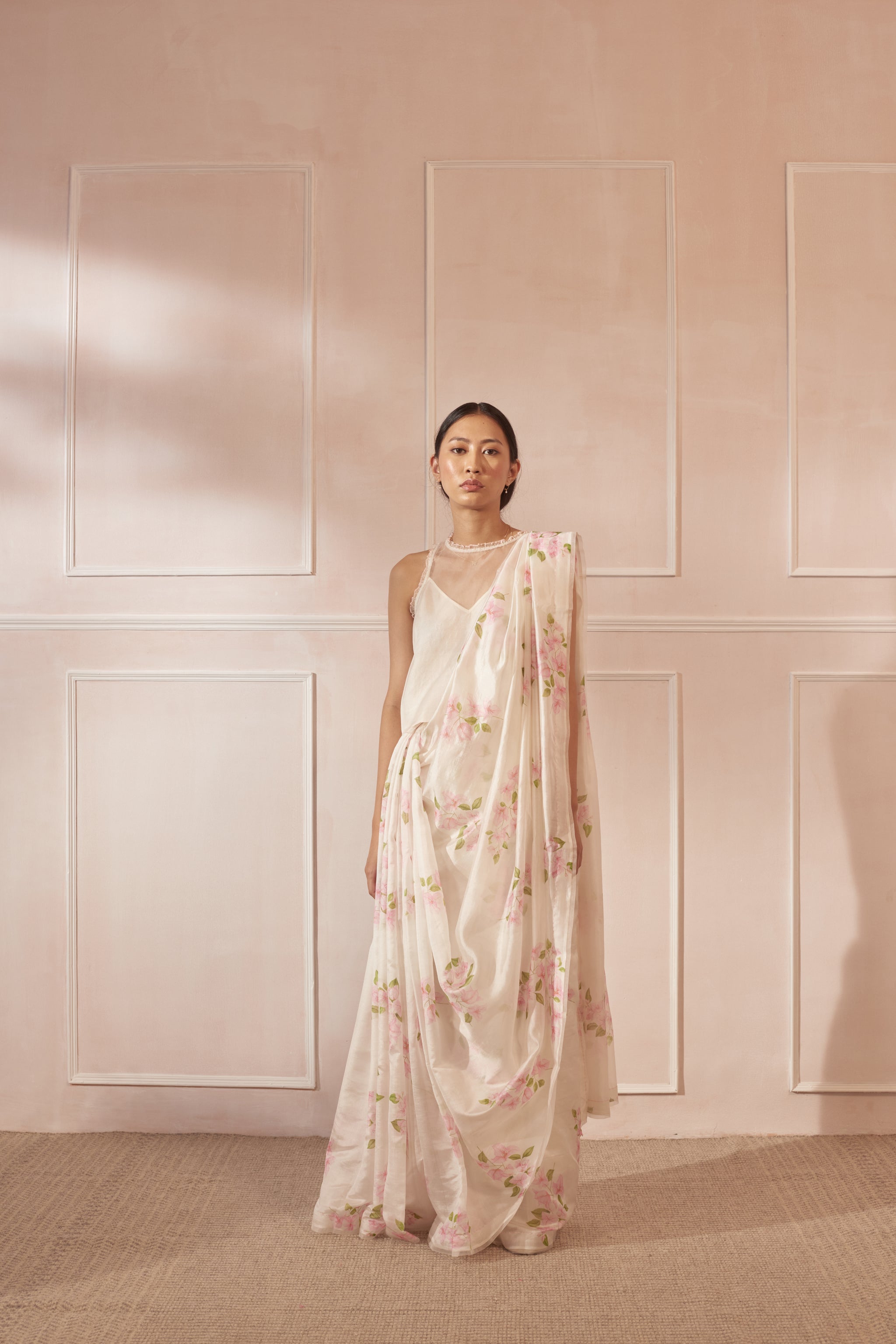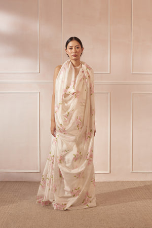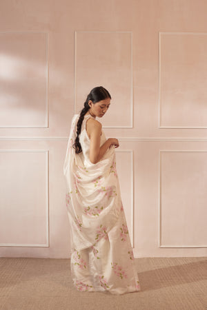 • Handwoven Mulberry Organza Silk Sari with printed Silk blouse pc Handwoven Mulberry and Organza Silk with Organza Border. Beaded Tassels. Hand Hemmed.