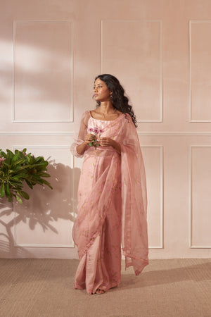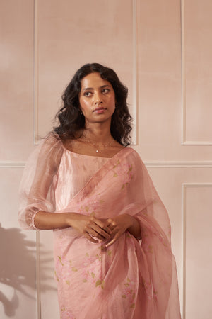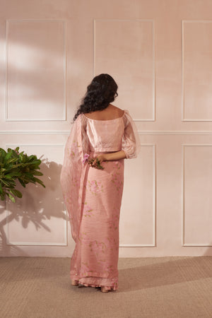 • Half Mulberry Silk and Half Silk Organza Sari with same print silk blouse pc Handwoven Mulberry Silk and half Silk Organza Sari with same print Silk blouse pcs. Beaded Tassels and Hand Hemmed.