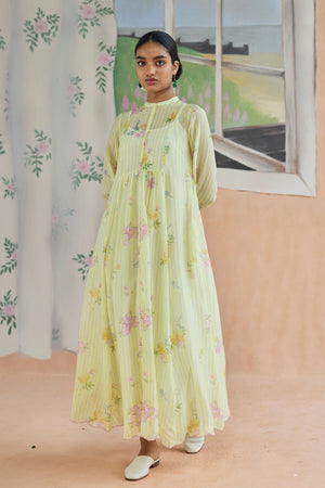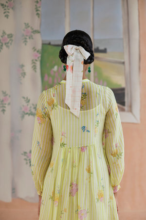 • Yellow wildflower dress in silk-cotton is a study in luminous elegance, where colour, print, and form are composed with refined subtlety. The yellow stripes lend the dress its distinct vibrancy that creates a perfect harmony with the fabric soft sheen. The relaxed fit ensures a sense of flowing ease, designed to drape gracefully. Its length and silhouette offer both fluidity and comfort. Scalloped edges the scalloped edges trace the garment with a gentle, wave-like rhythm. Model is 5 feet 7 inches tall and is wearing size small. Dress length is xx inches