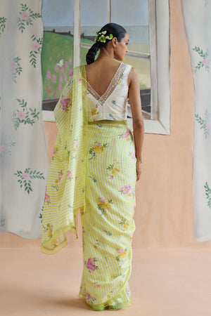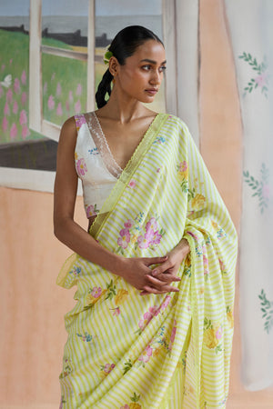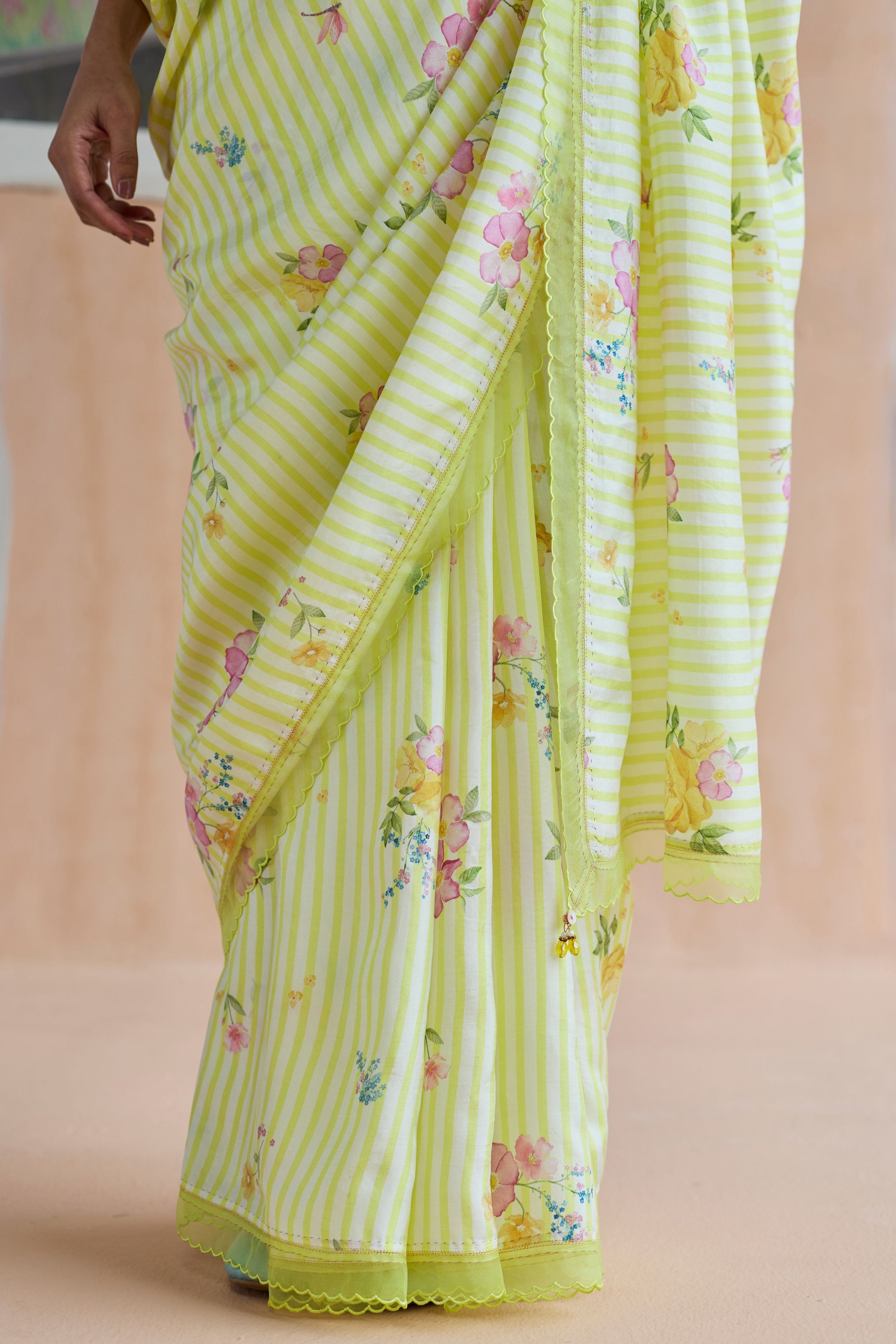 • Yellow stripe sari in handwoven mulberry silk is joyful yet composed, and a radiant expression of contemporary elegance rooted in craft. The off-white floral print blouse lends a soft contrast that brings textural and visual interplay to the look. Thoughtfully designed and intricately finished embroidered, scalloped edge introduce texture, movement, and definition—elevating the sari from simply beautiful to exceptionally crafted. The naturally lustrous silk drapes with effortless fluidity, making it the perfect union of tradition and modern detailing.