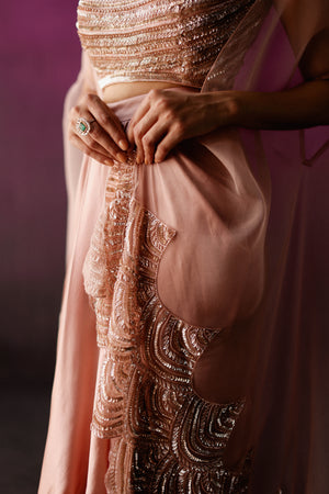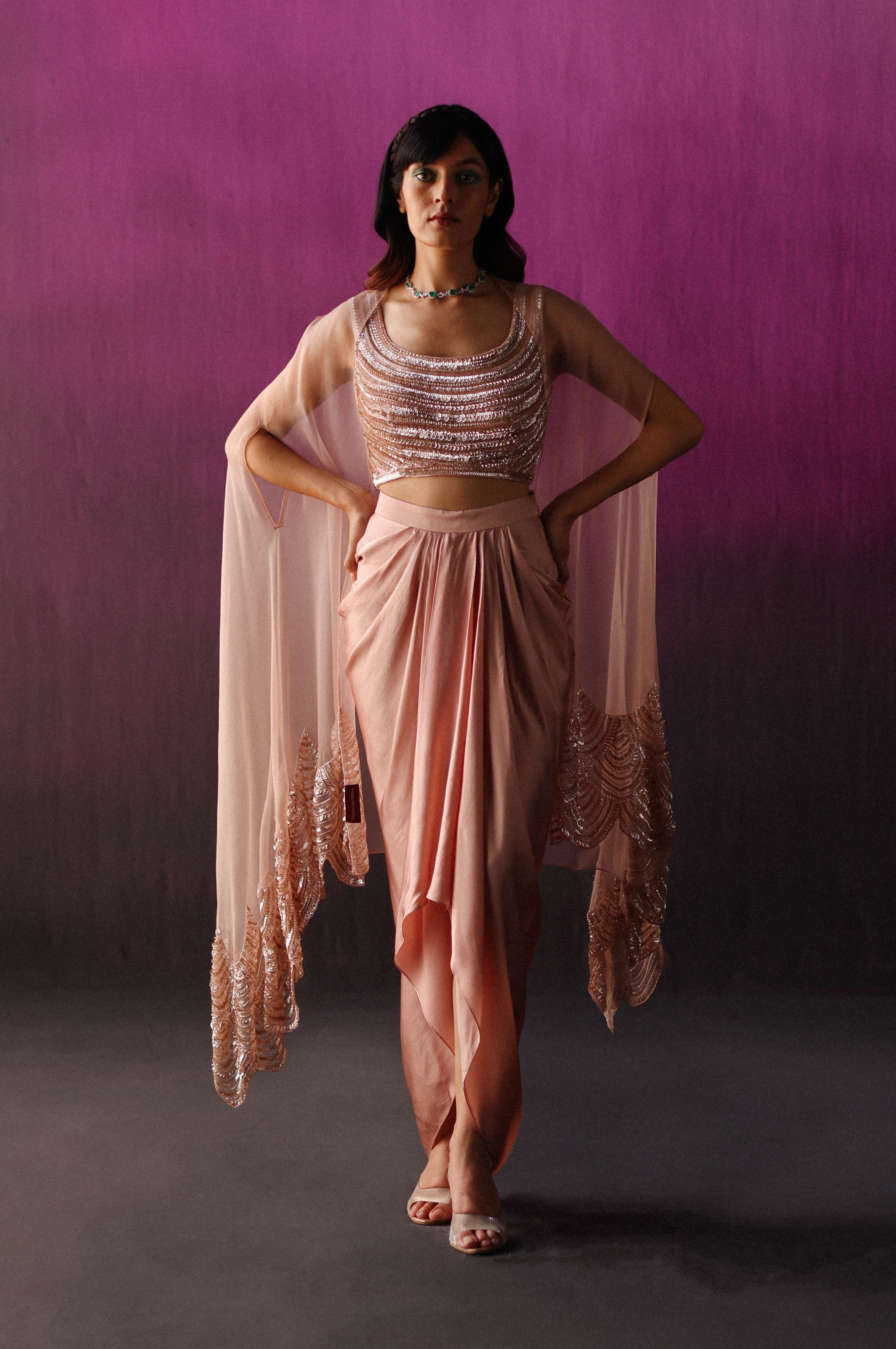 • Sequin and crystal embroidered blouse paired with a satin dhoti skirt and embroidered organza cape