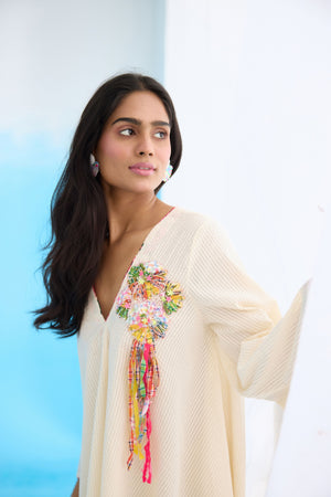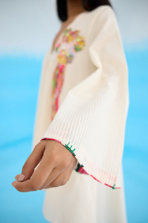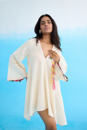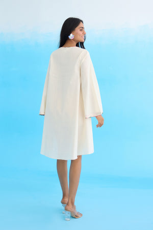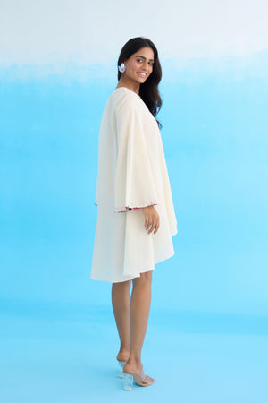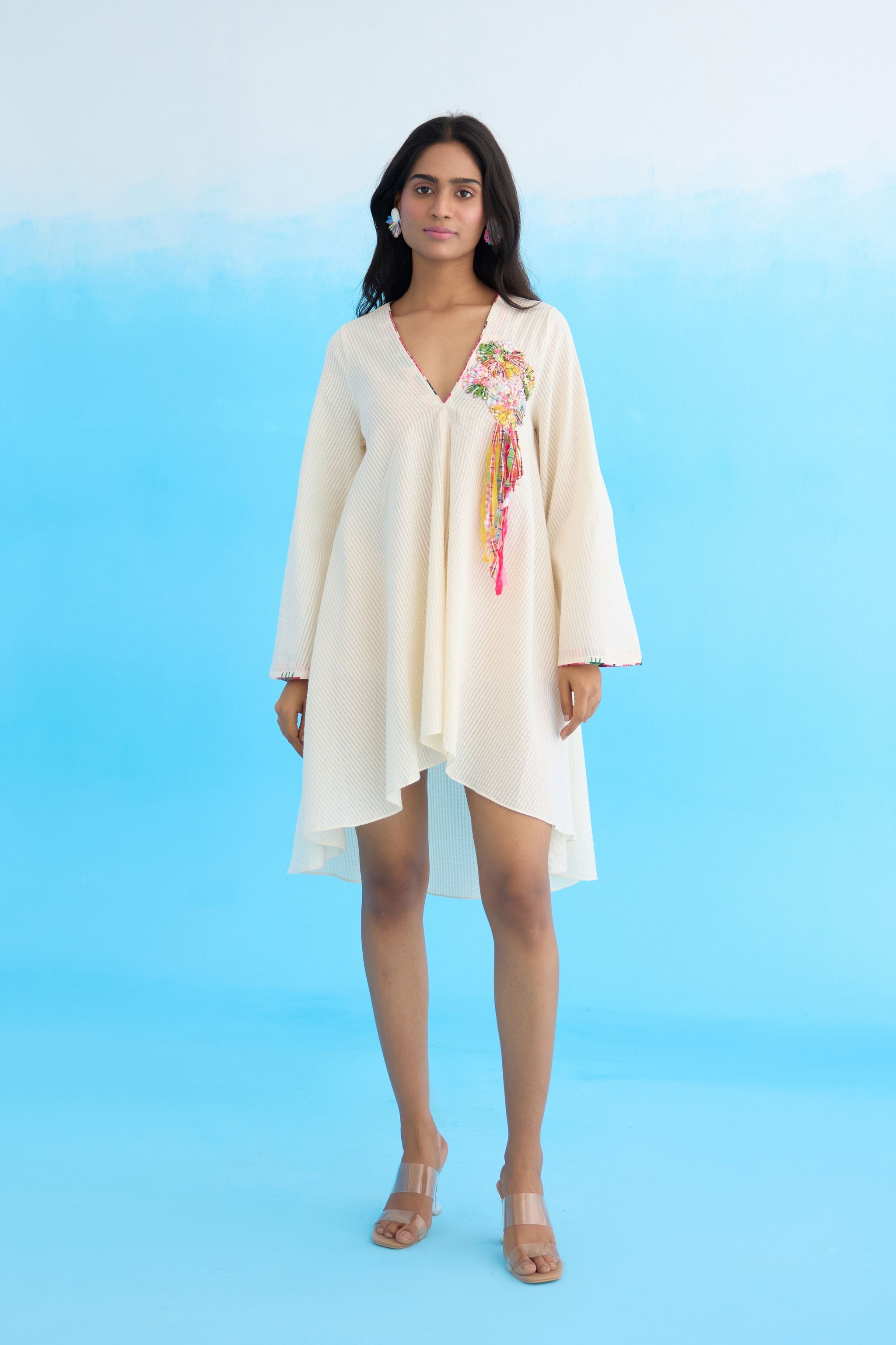 • Cream hi-low A-line bell sleeves mini dress with fabric ribbon embroidery applique details in 100% seersucker cotton.