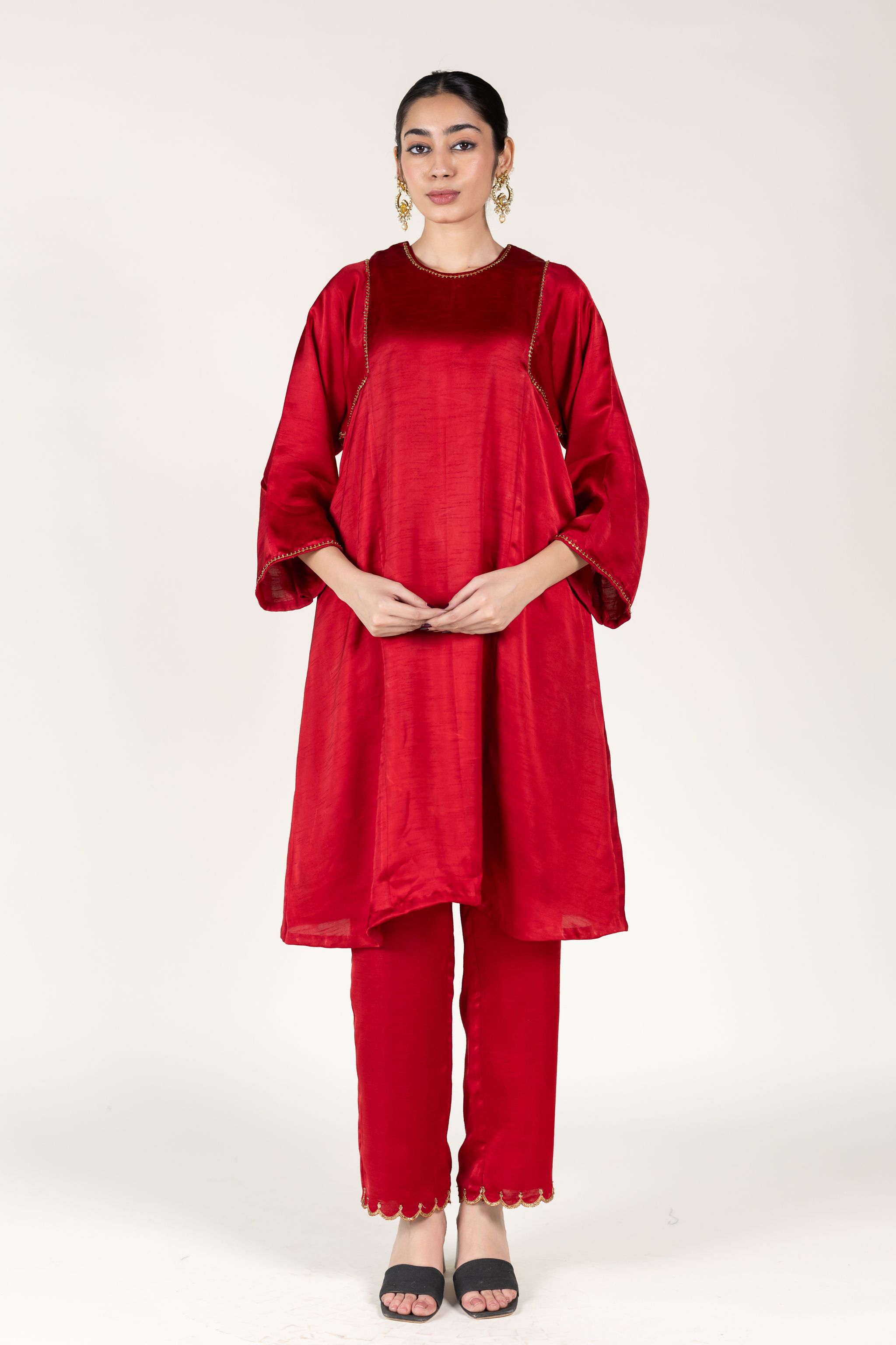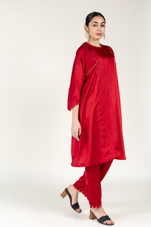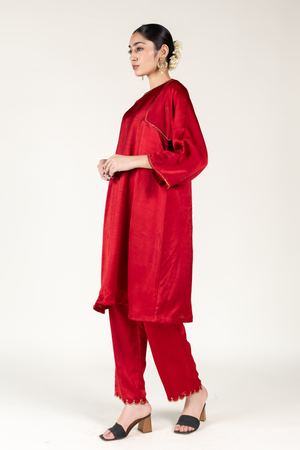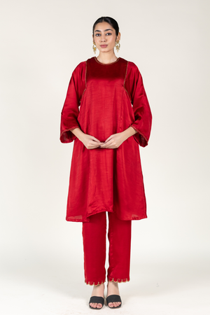 • Red silk kurta inspired by royal chogas, paired with straight pants for a timeless and regal silhouette.