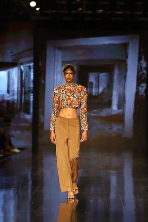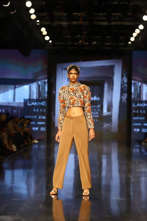 • Multicolor power shoulder hand-embroidered beige crop top paired with caramel brown center creased ankle-length straight pants