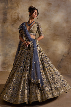 • Blue grey net lehenga choli and dupatta set embroidered with gold and silver beads, sequins and crystalss