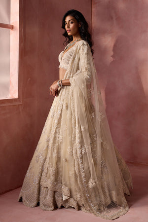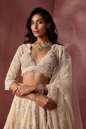 • Ivory organza lehenga choli dupatta set intricately embroidered in a floral pattern with tonal resham , sequins, beads and crystals