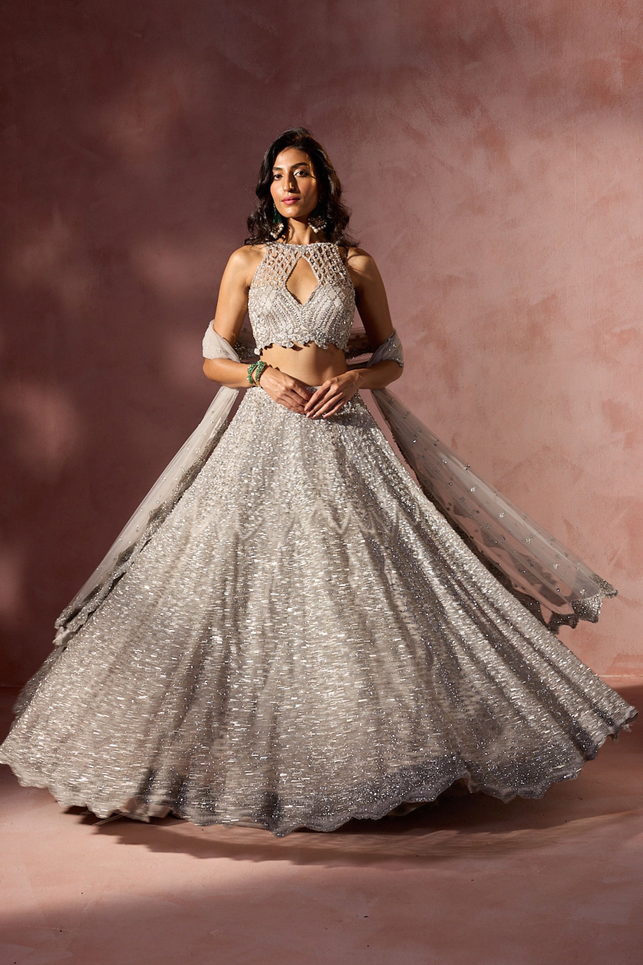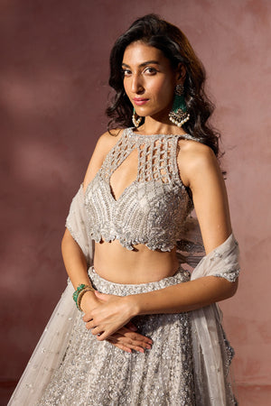 • Silver grey net lehenga choli and dupatta set embroidered with silver metallics, beads , sequins and crystals