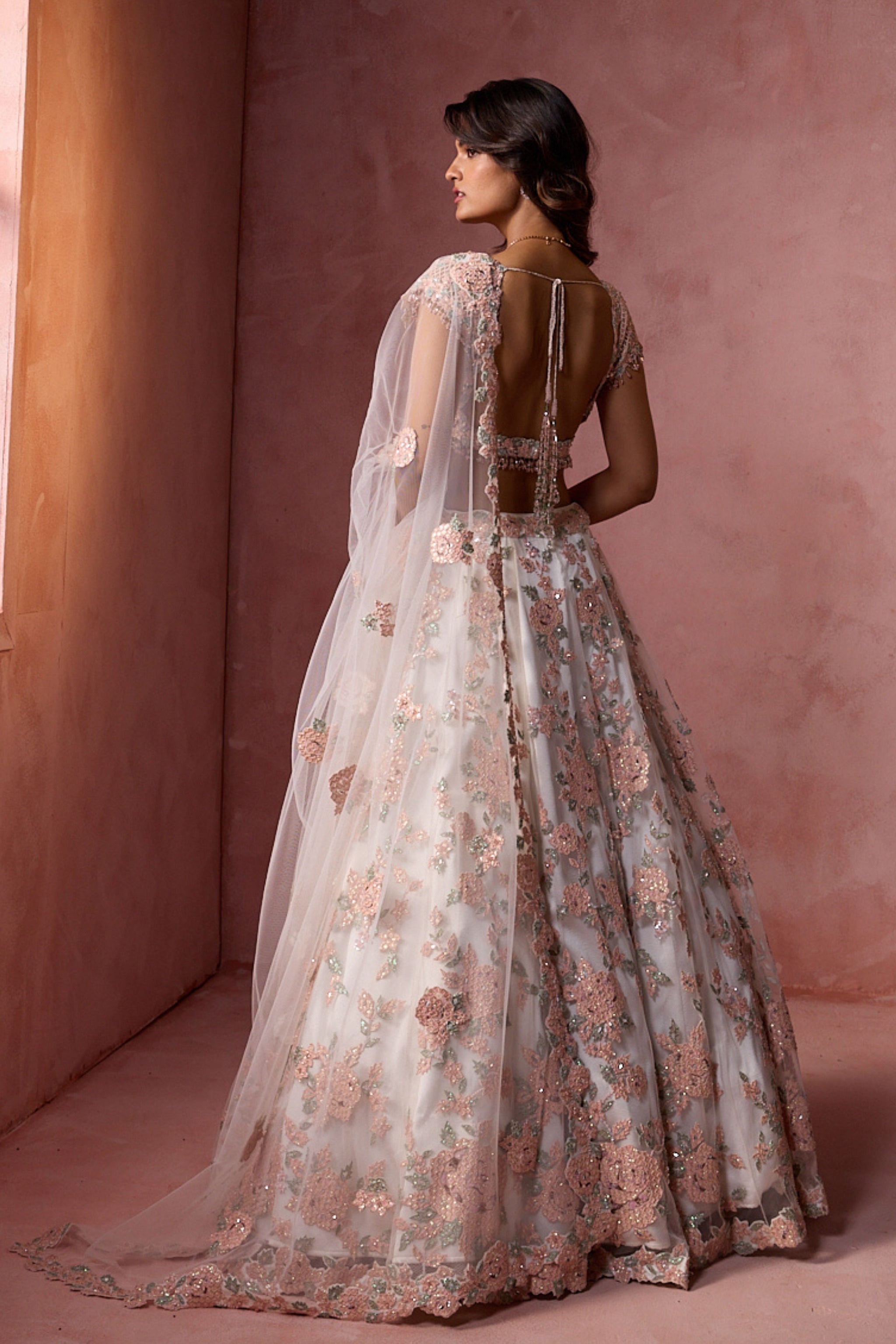 • Whte net lehenga choli and dupatta set with a floral leather applique embroidery highlighted with beads, sequins and crystals