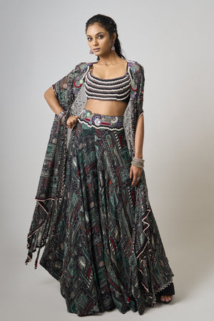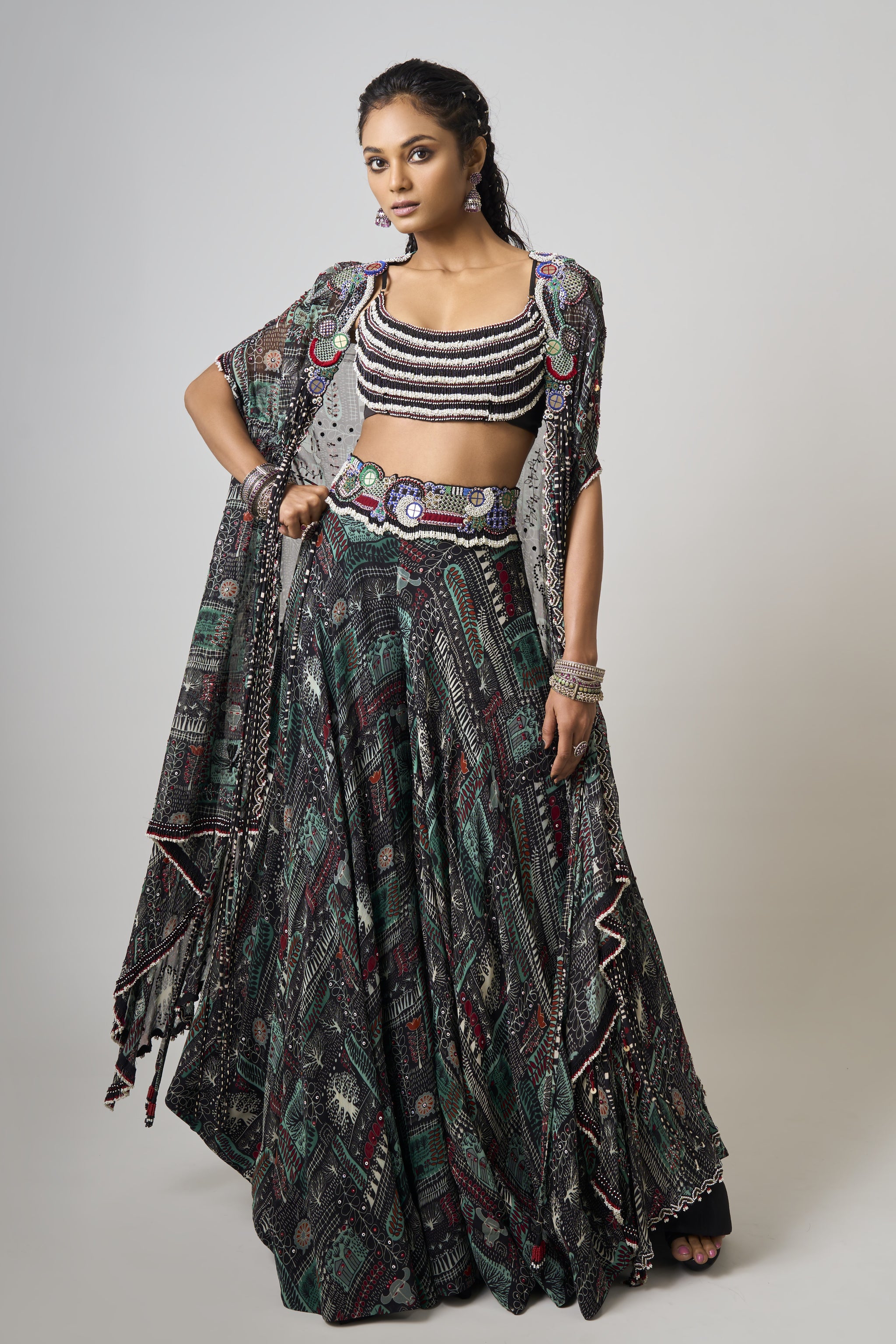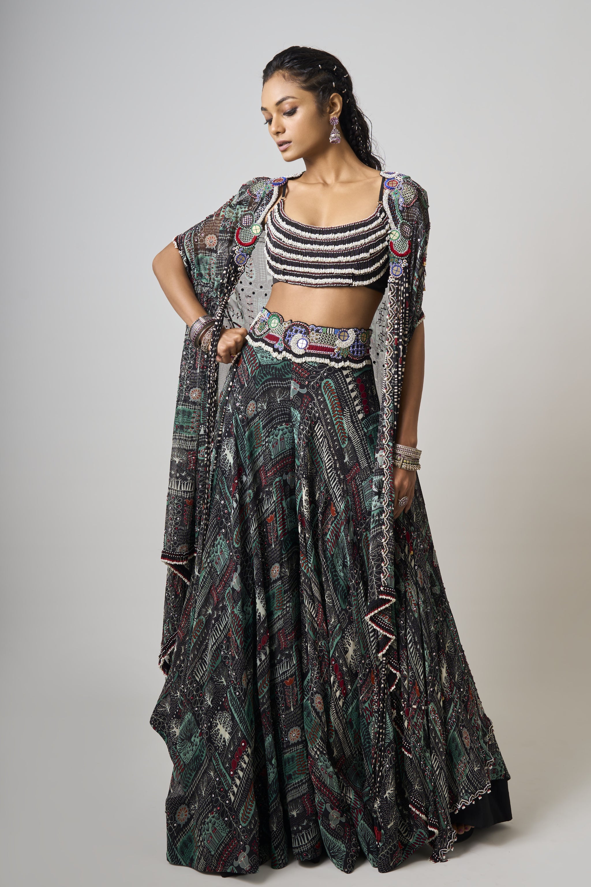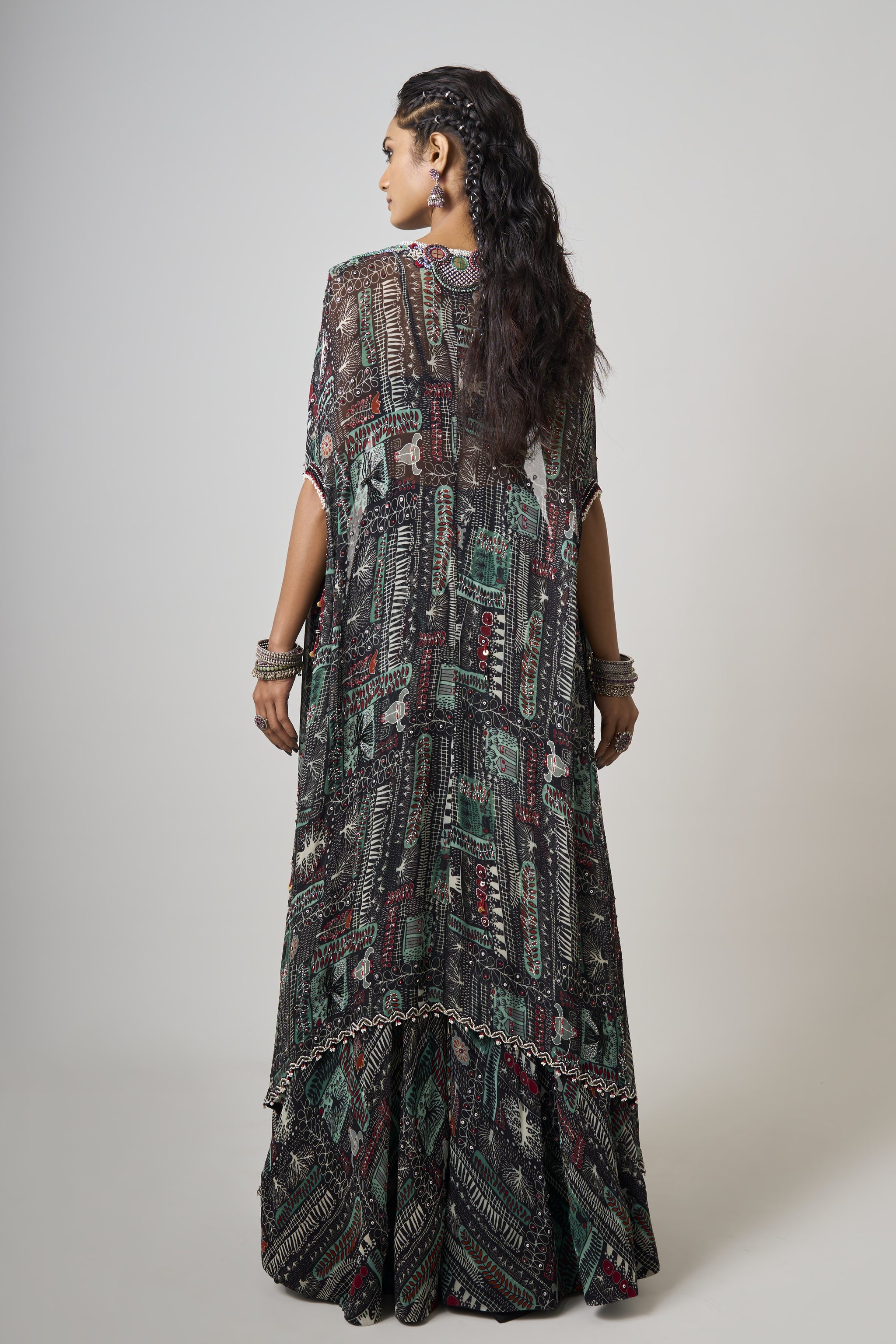 • Black printed & hand embroidered dupatta cape with tribal blouse and circular pants