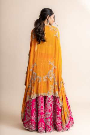 • Fuchsia hand embroidered lehenga and blouse with orange dupatta cape