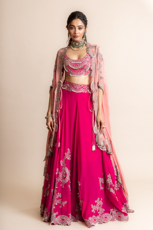 • Fuchsia hand embroidered lehenga and yoke blouse with dusty-rose dupatta cape