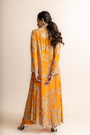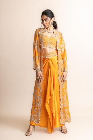 • Orange hand embroidered closed long jacket and bustier with orange satin pick-up skirt