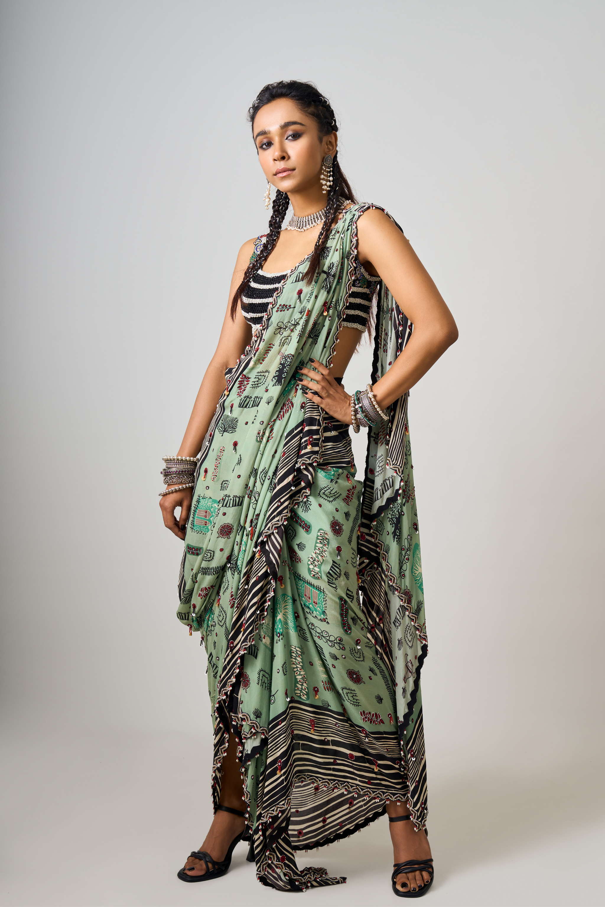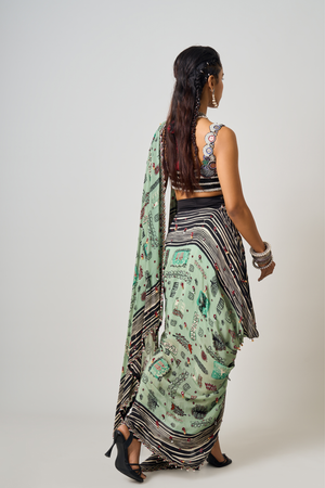 • Mint printed & hand embroidered pre draped cowl sari with tribal stripes blouse