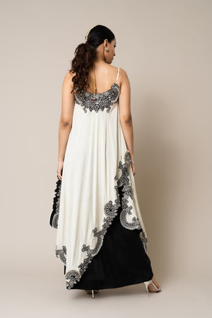 • Off-white hand embroidered strappy singlet top with black satin circular gather skirt
