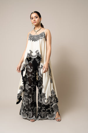 • Off-white hand embroidered strappy singlet top with black embroidered straight pant