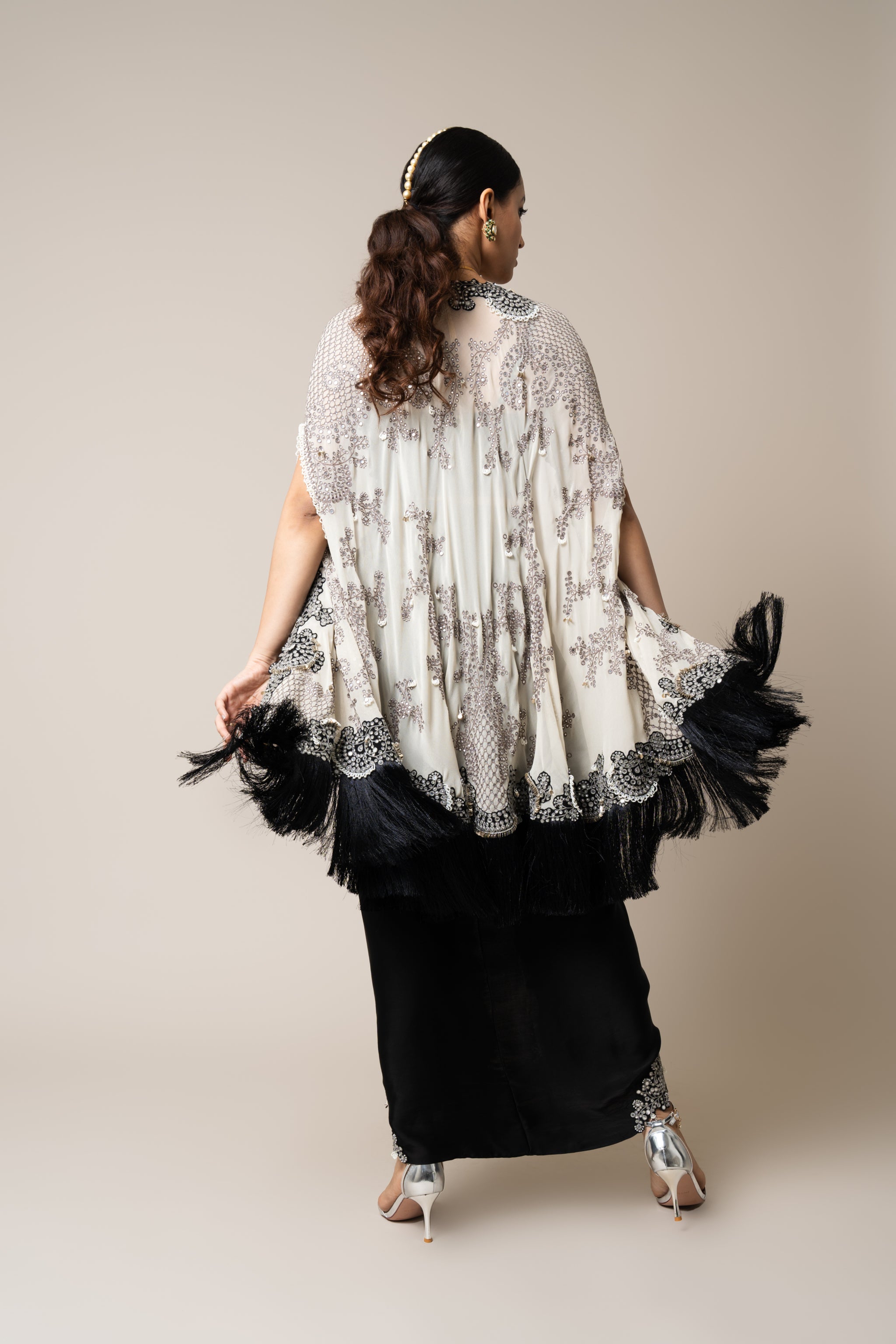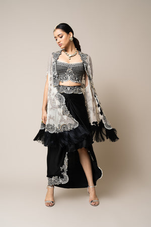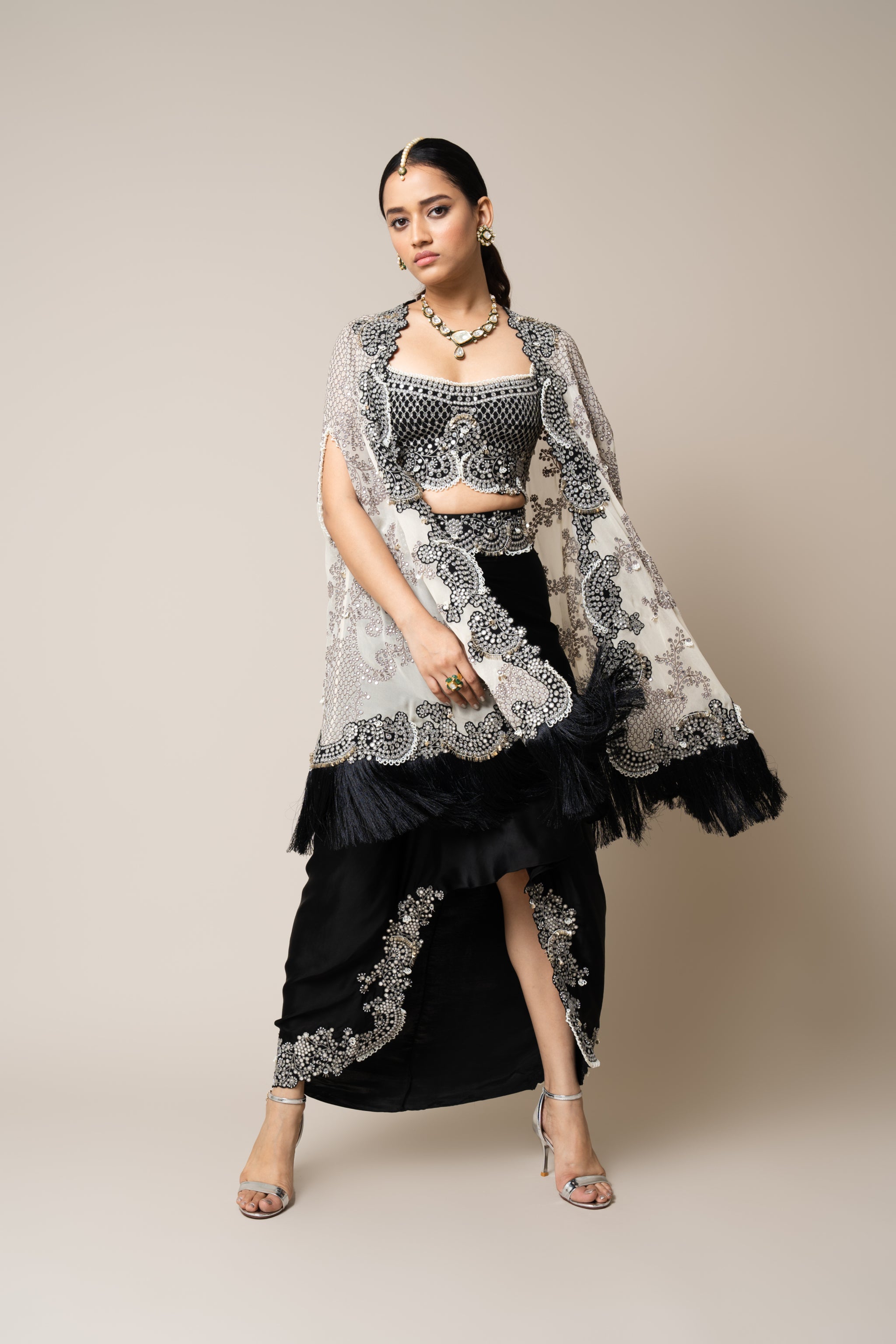 • Off-white hand embroidered short cape with black embroidered bustier and pick up skirt