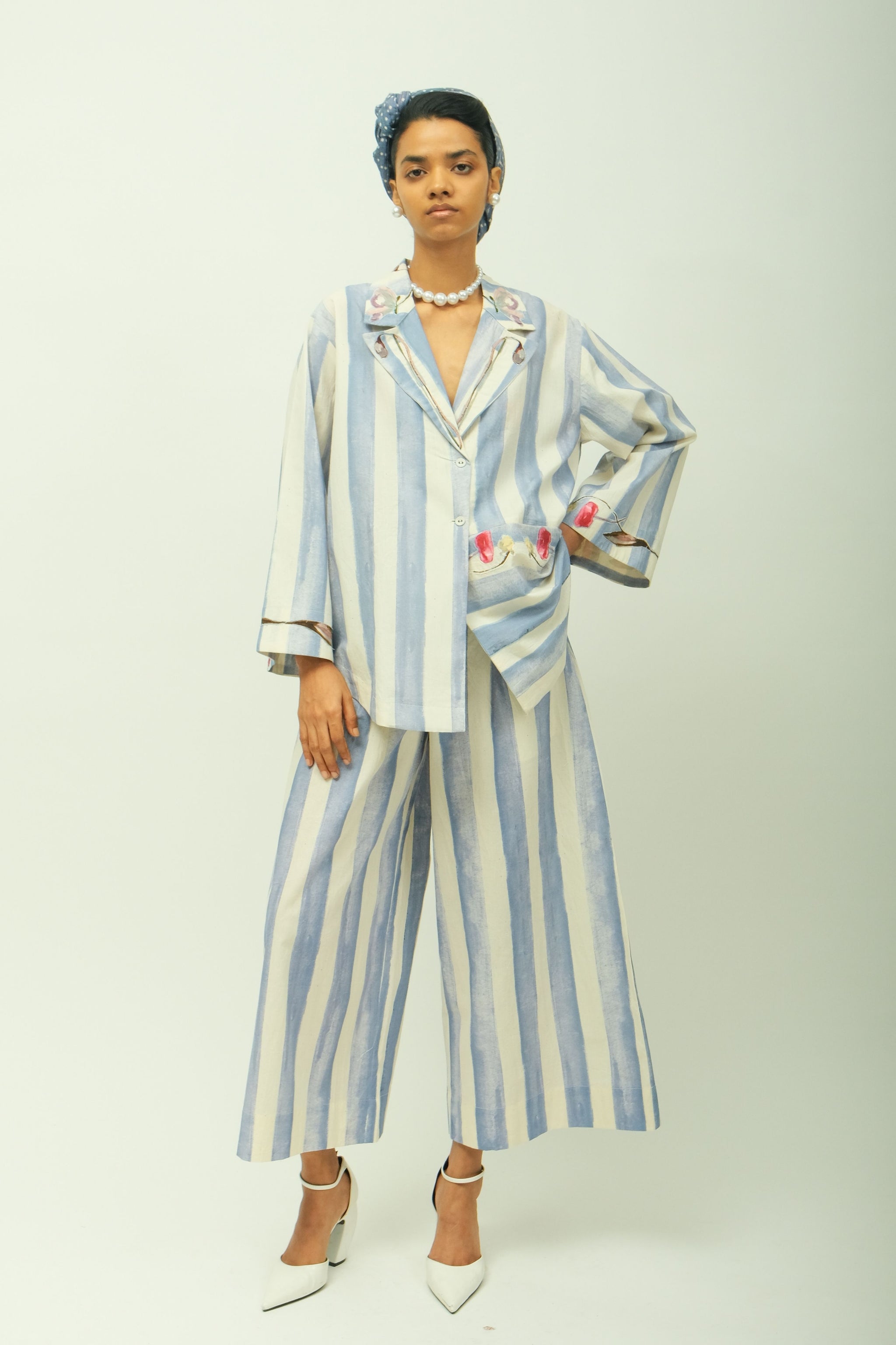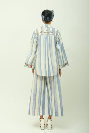 • An anti-fit top featuring a notched lapel collar, full sleeves, and a curved hem. Showcasing a hand-painted abstract expressionist print with appliquéd florals and embroidered cuffs. Designed with side pockets for added comfort. Paired with anti-fit straight pants featuring a front belt, drawstring, back elastic, and side pockets. The same digitally transferred hand-painted print continues throughout. Print placement may vary-single piece.  Shirt length- 28", Pant length- 36".