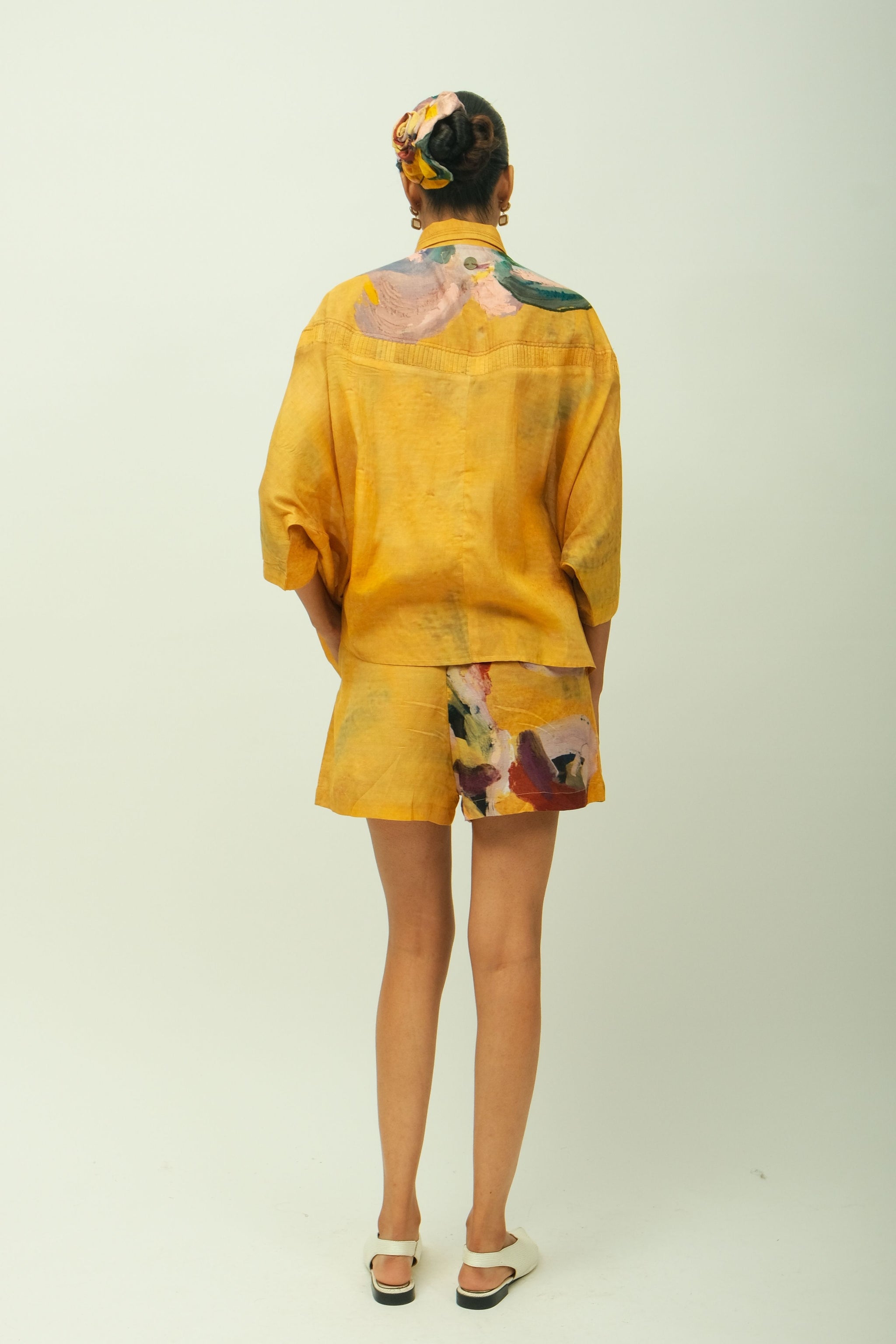 • Short-sleeved, anti-fit silhouette with vertical pintucks on the front. Designed in a soft, breathable dotted dobby fabric with a digitally transferred hand-painted abstract expressionist print. The lightweight construction ensures all-day comfort and understated elegance. Each piece is one of a kind-print placement may vary. Garment Length- 27"