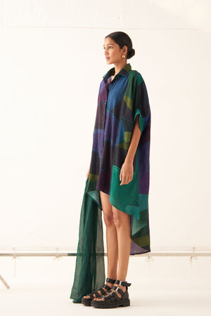 • Got certified azo-free dyes, anti-fit, hand-painted abstract expressionist digitally transferred print, shirt collar with full front placket, high-low hem, insert detailings at front, back yoke with center back insert, batwing sleeves, and hand-embossed vintage indian coin detail at back. Front length is 32" and back length is 47.5".