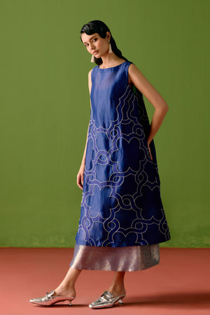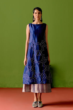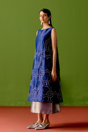 • A vision of ethereal elegance, this dress is crafted in pure organza silk, elevated with a delicate inner layer of chanderi silk and kimkhwaab tanchoi tissue that adds depth, luminosity, and graceful movement. Designed as a tribute to timeless artistry, the piece draws inspiration from art deco geometry and the intricate symmetry of islamic art, reinterpreted through a contemporary couture lens. Please note, all pieces are made by hand, celebrating handwoven fabrics and hand made, hence there might be some irregularities from piece to piece.