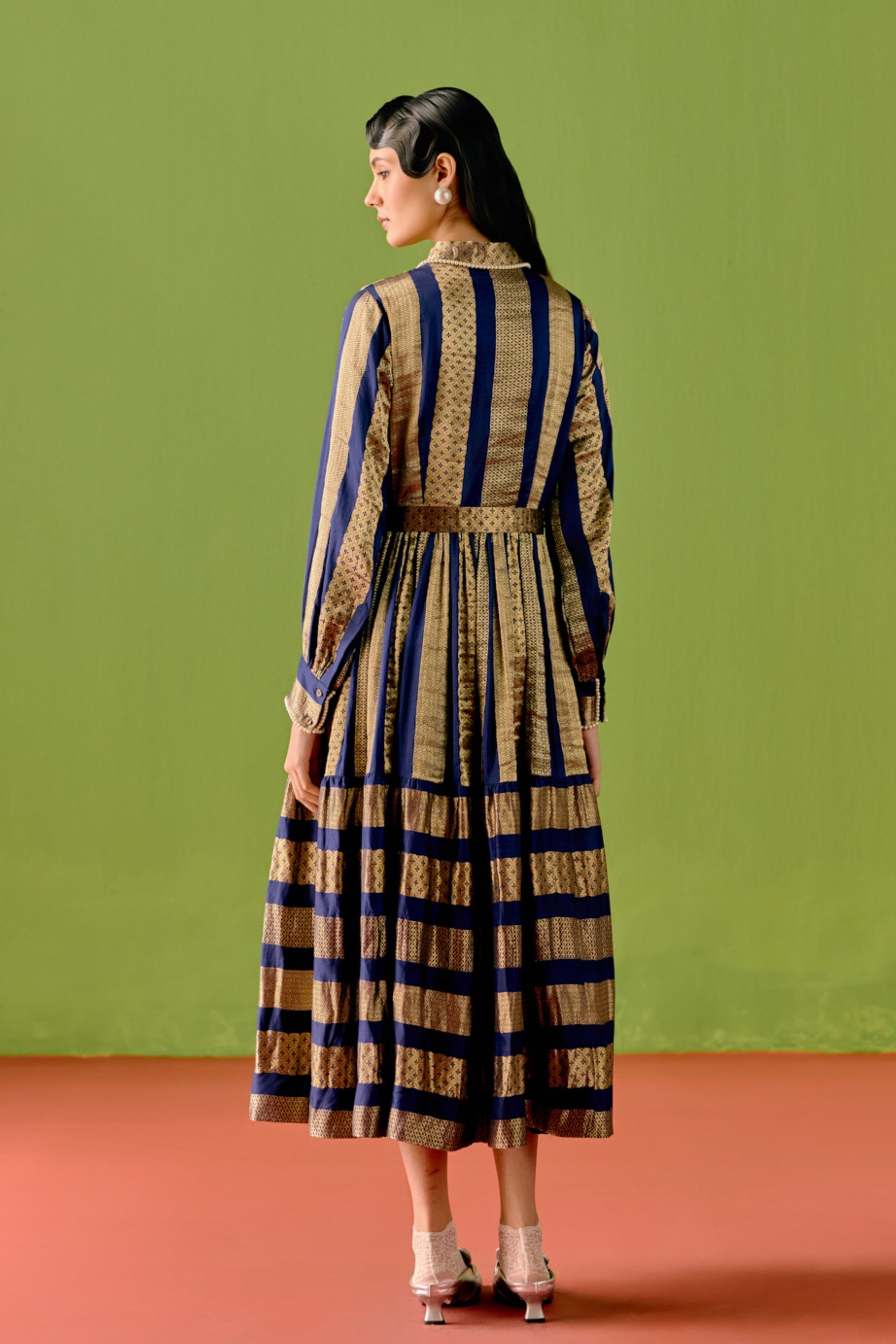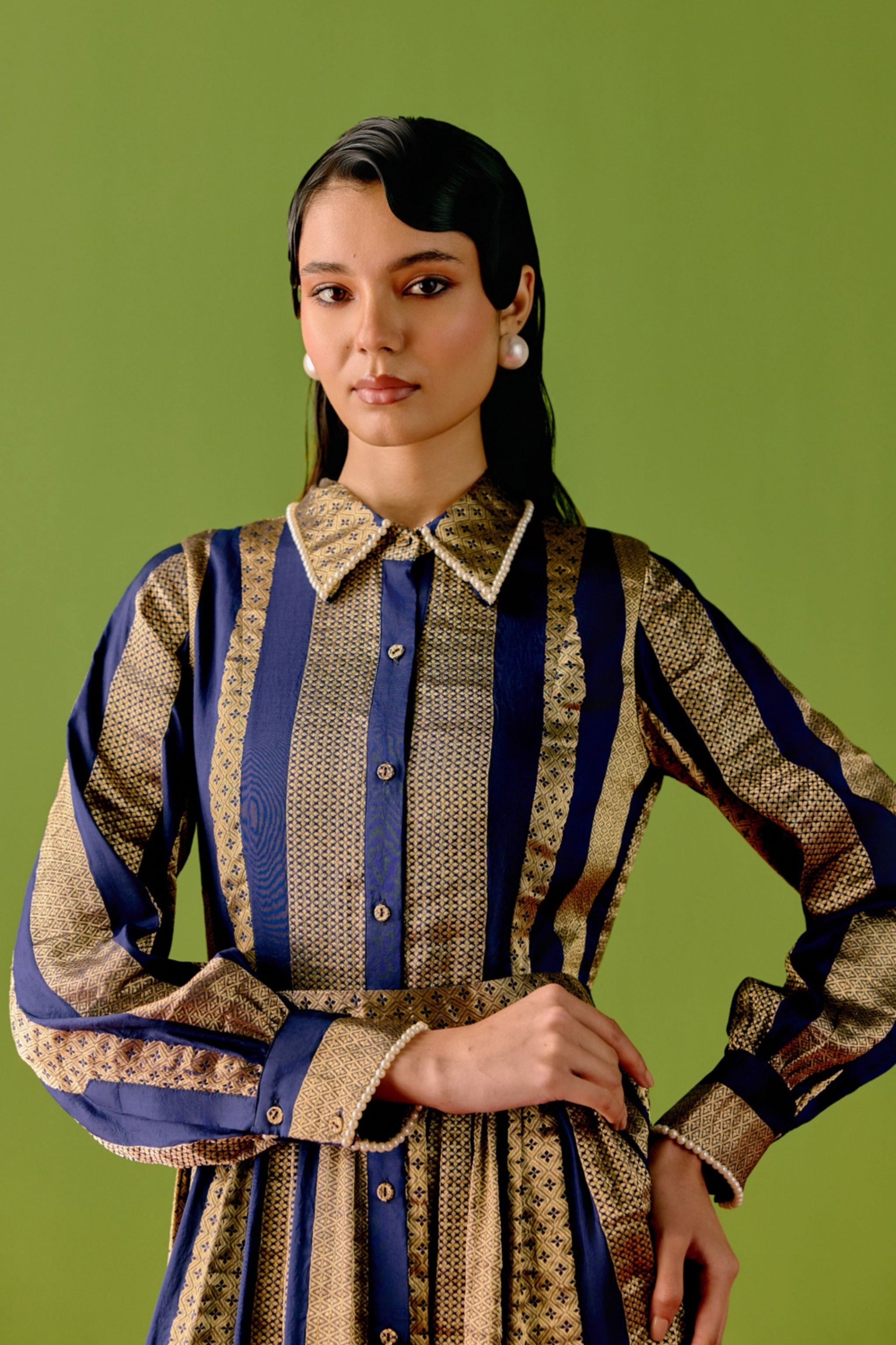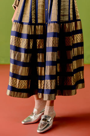 • An ode to timeless glamour, this handwoven brocade dress captures the refined opulence of the art deco era, reinterpreted for the modern global woman. Meticulously crafted from luxurious hand-woven brocade, the dress celebrates heritage weaving while embracing clean, architectural silhouettes inspired by the 1920s. Intricate pearl embellishments add a soft luminosity, echoing the geometric sophistication and understated decadence synonymous with art deco design. Please note, all pieces are made by hand, celebrating handwoven fabrics and hand made, hence there might be some irregularities from piece to piece.