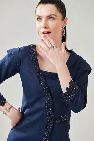 • Geometric structured blazer with hand embroidered sleeves and flap detail. Comes with separate inner. Eye hook closure on blazer. Pants are bell bottoms. Embroider material- sequence, katdana, beads