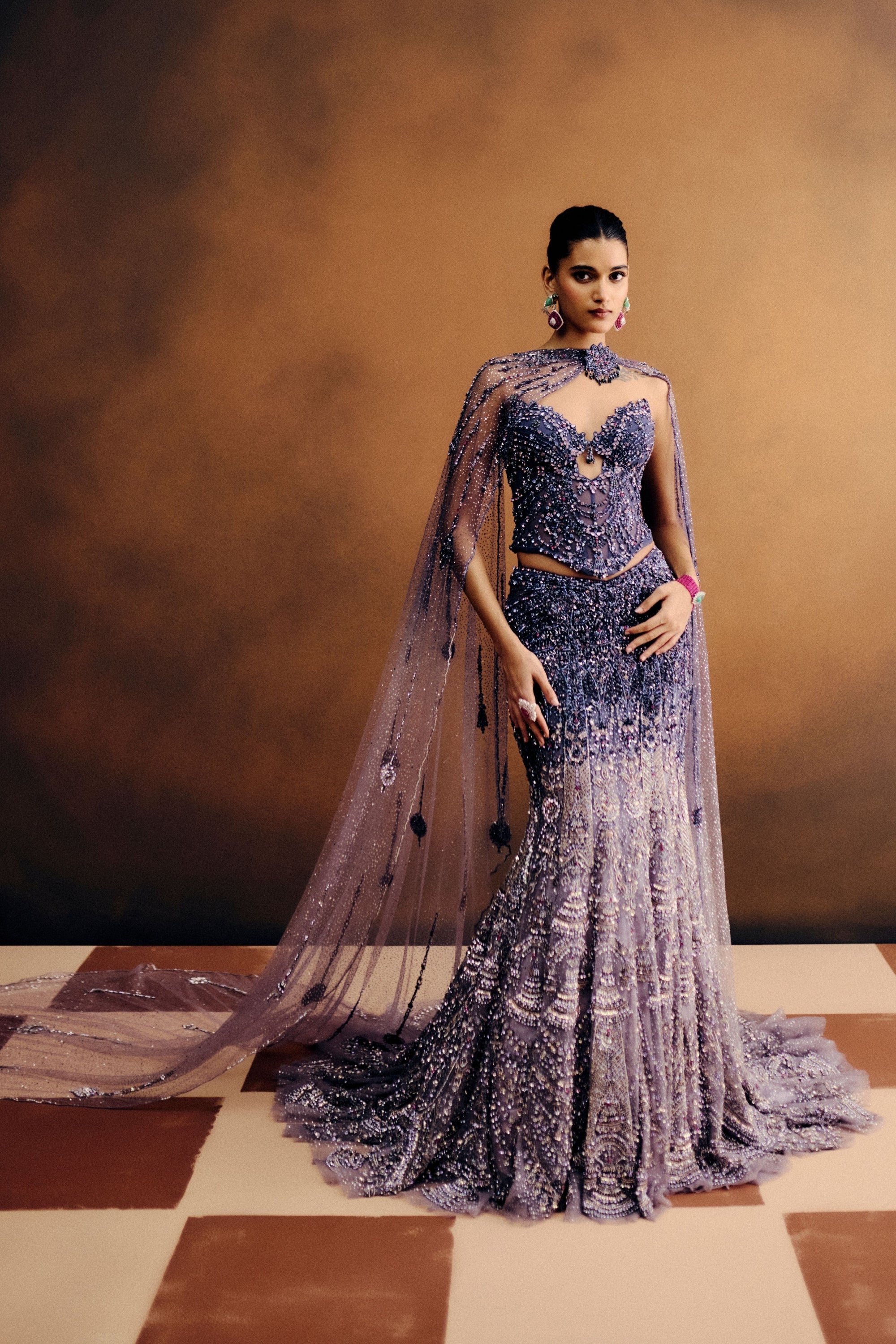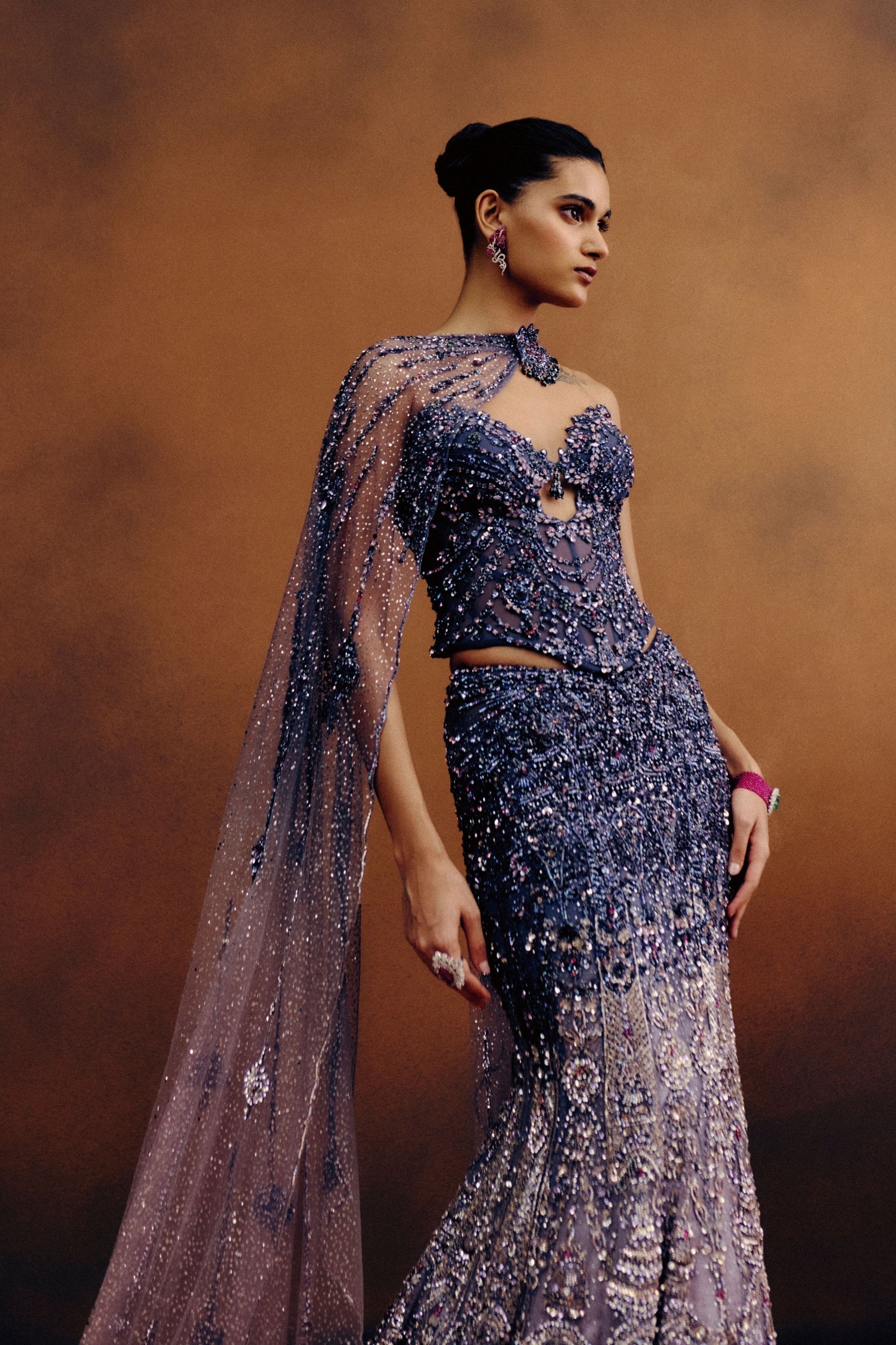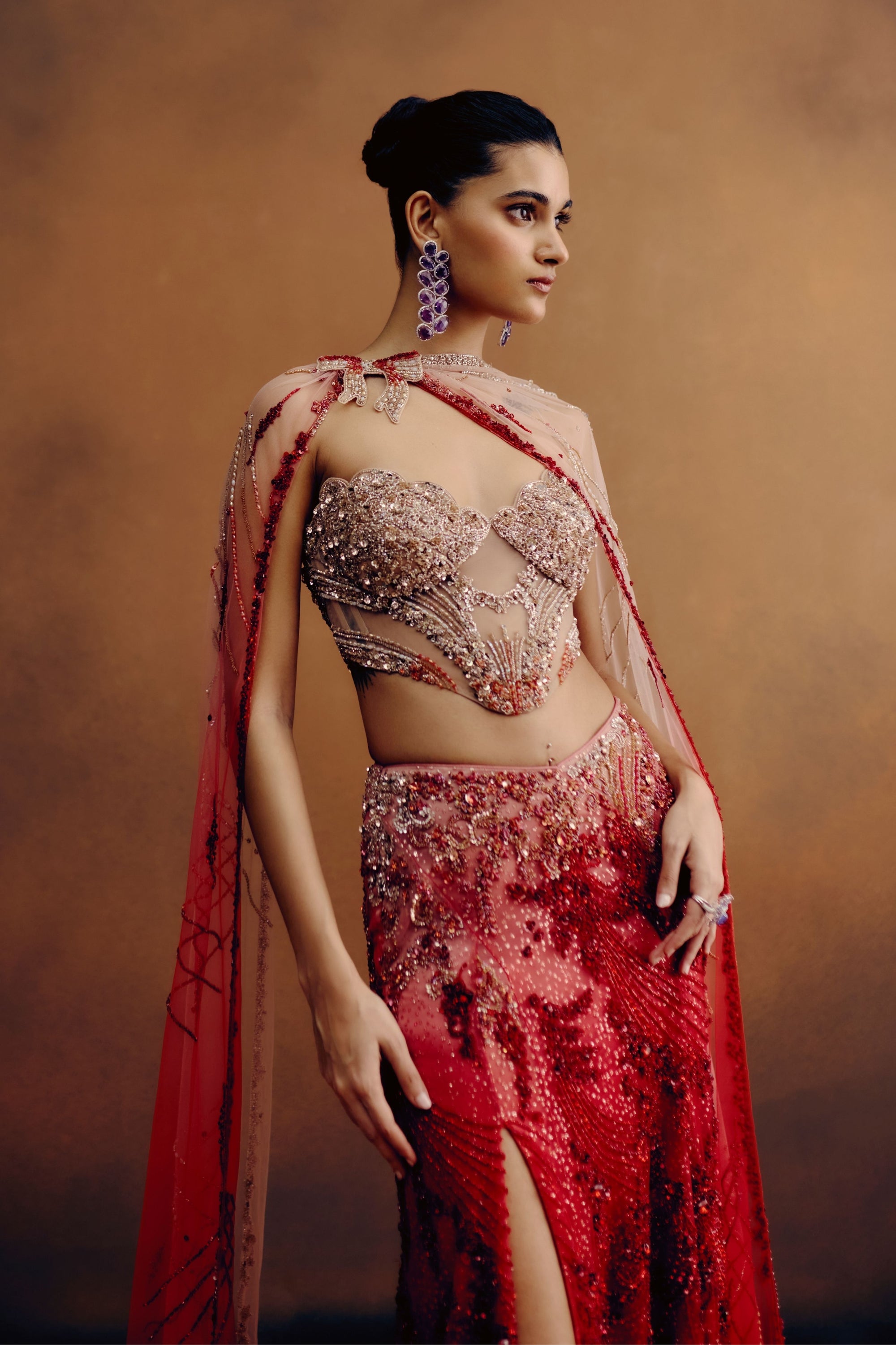 • Dusky orange chiffon ditsy floral one shoulder draped gown with embellishment & feathers on the body and enhanced with a thin embroidered belt