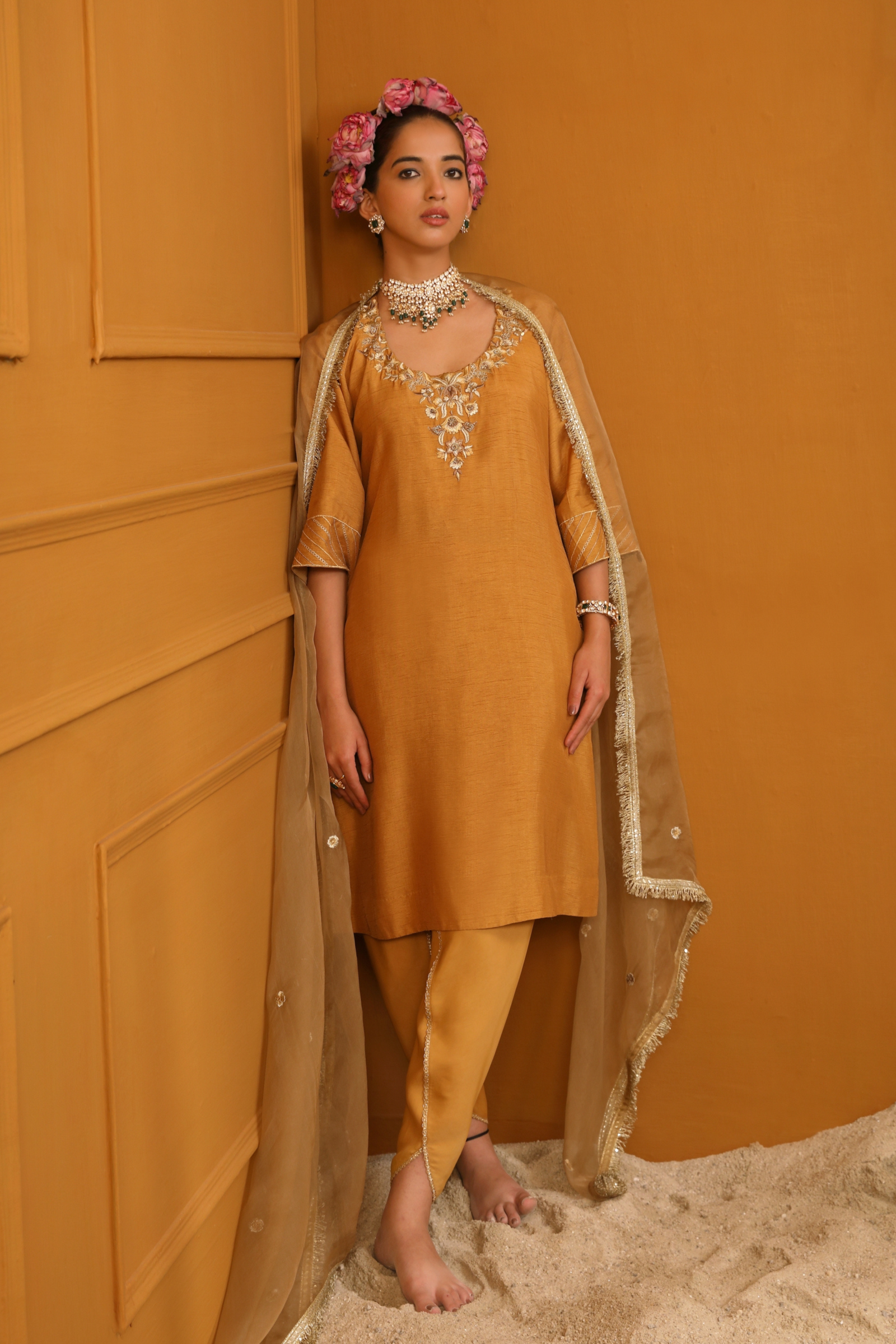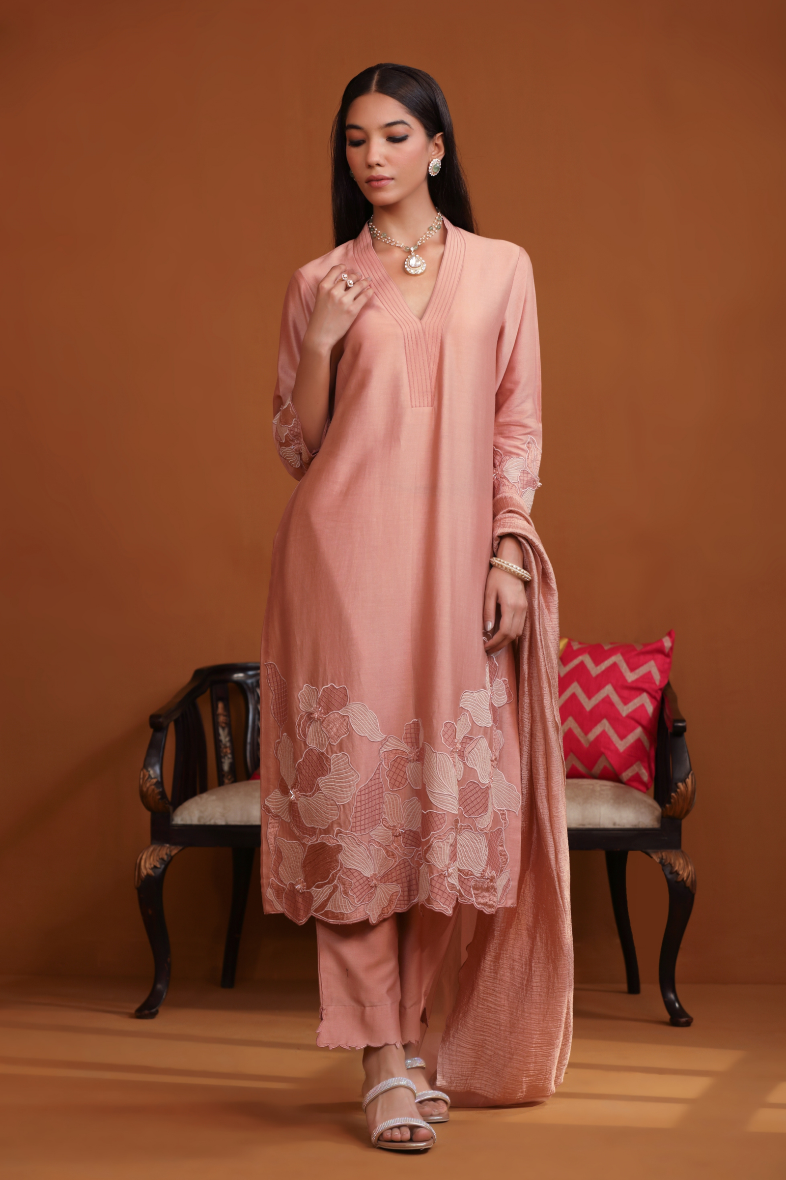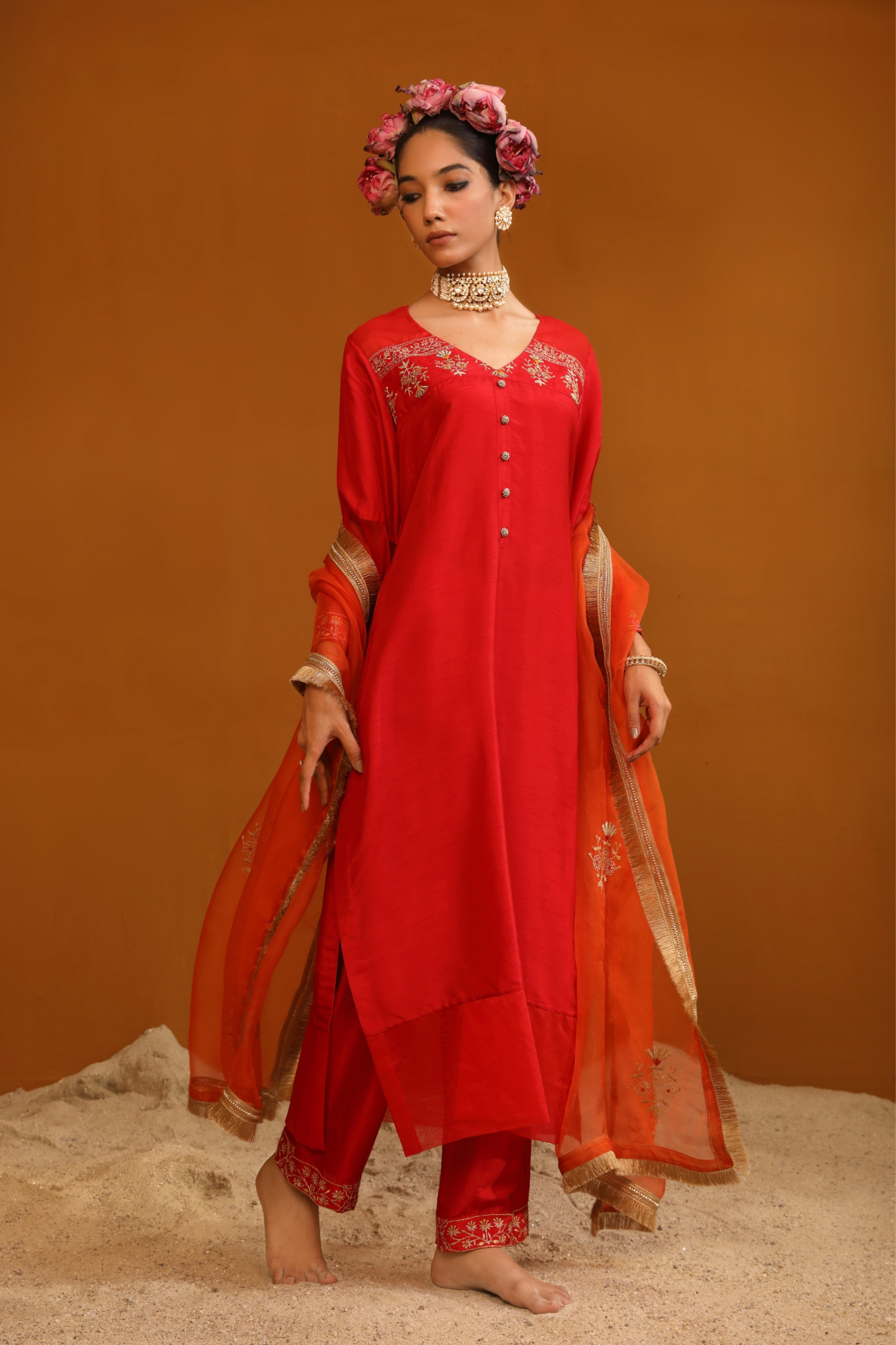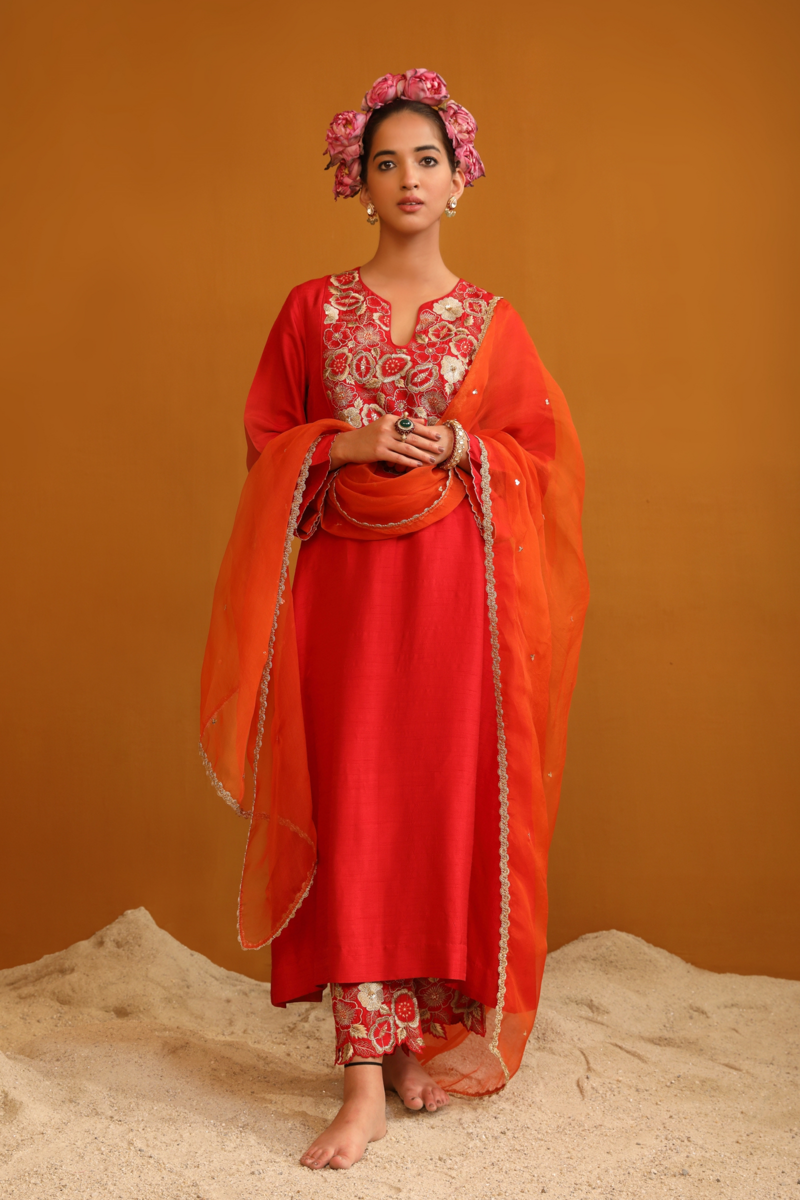 • Featuring our orange kurta set with fine embroidery combined with delicate applique patch work around the neck and bootas spread all over the kurta. The a-line flowy silhouette ensures comfort and ease paired with matching trousers and accessorized with a beautiful tonal crushed silk & organza dupatta with hangings.