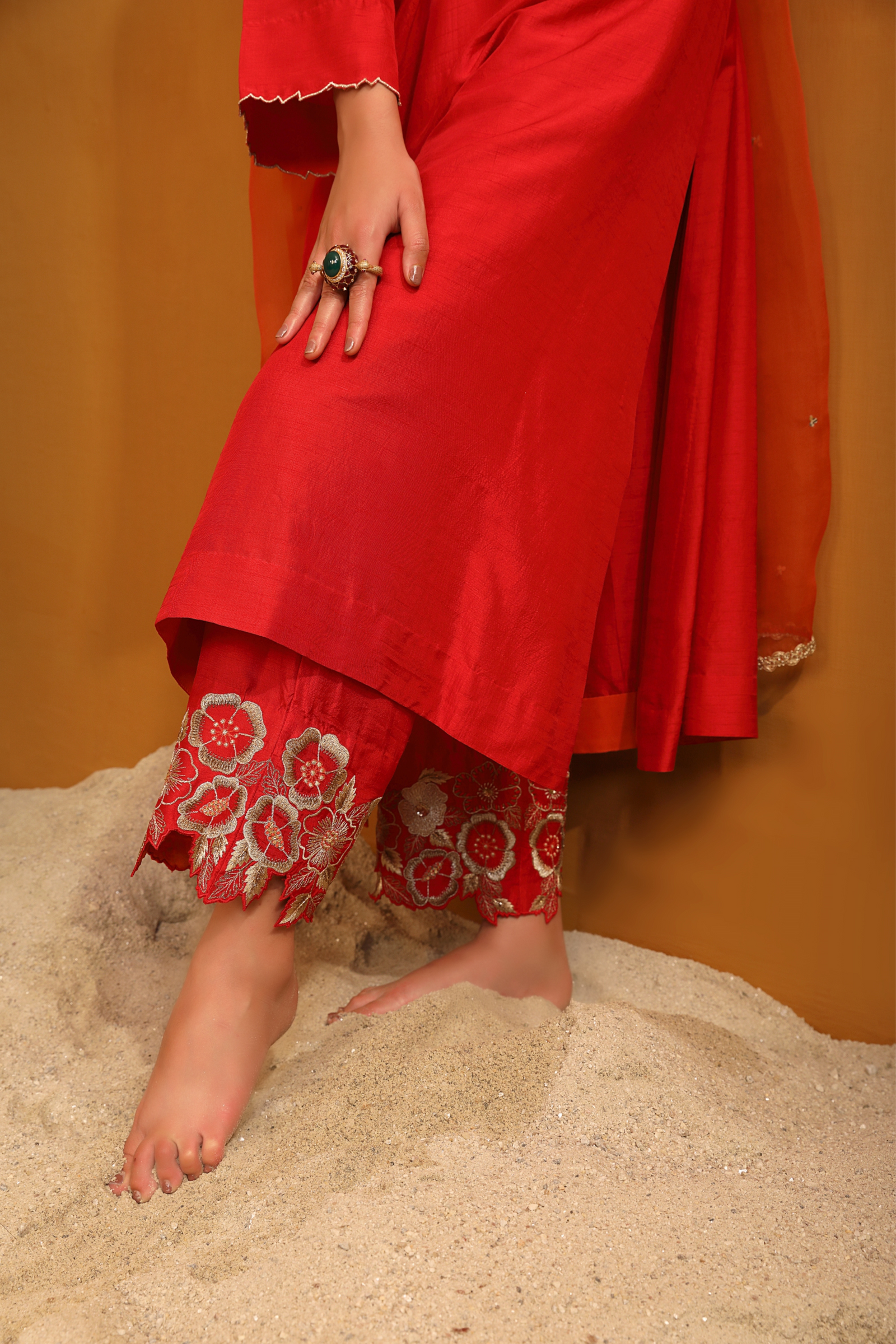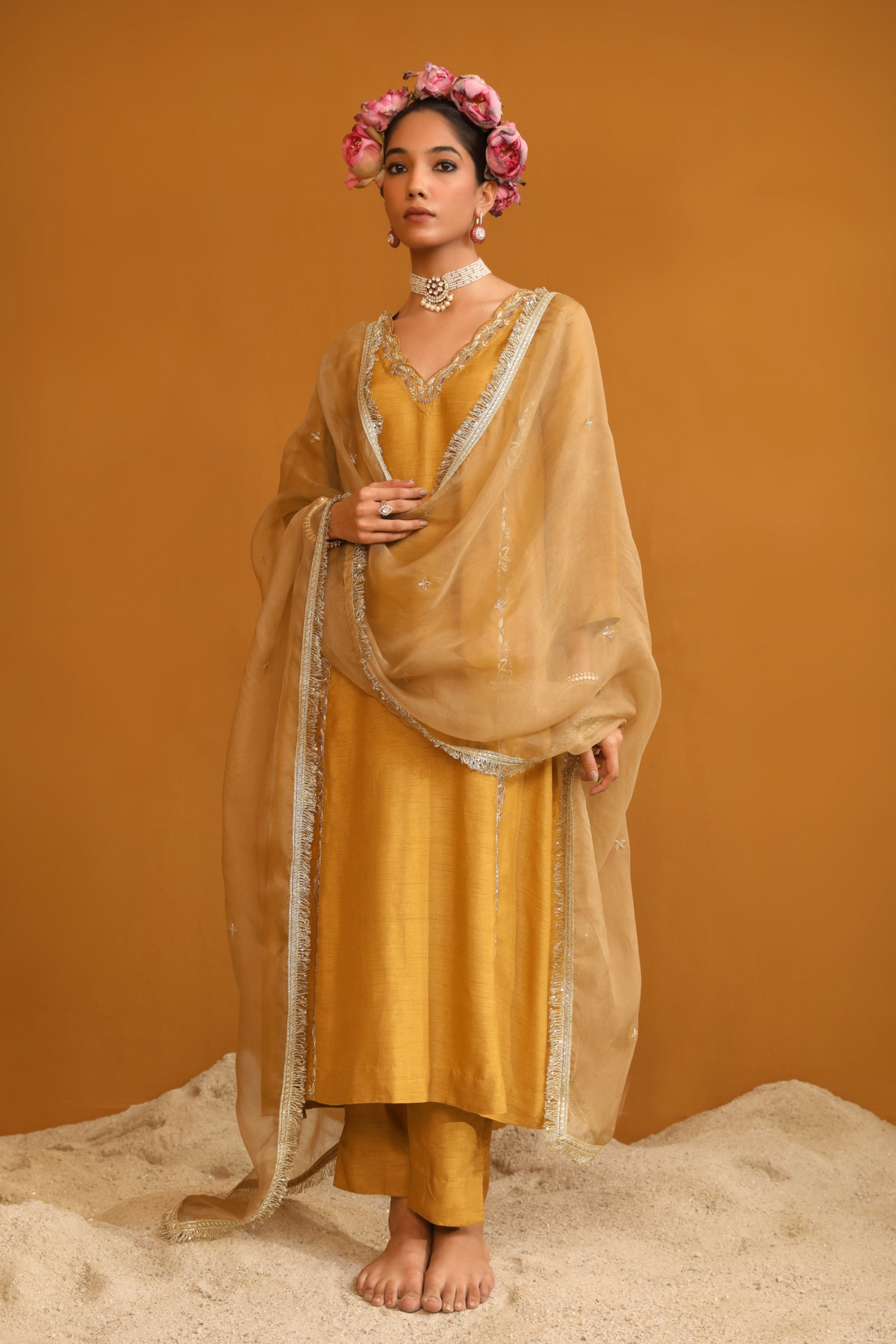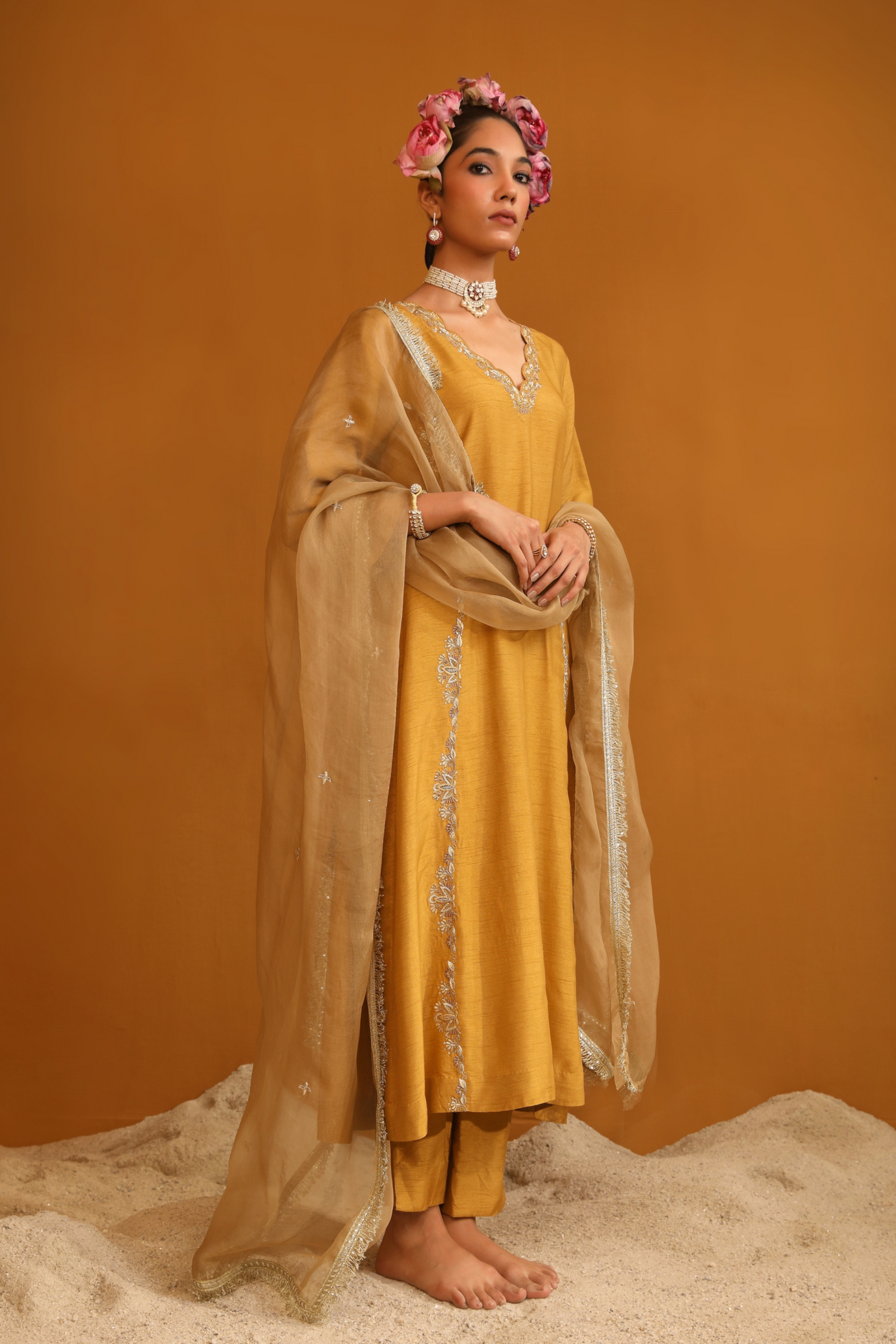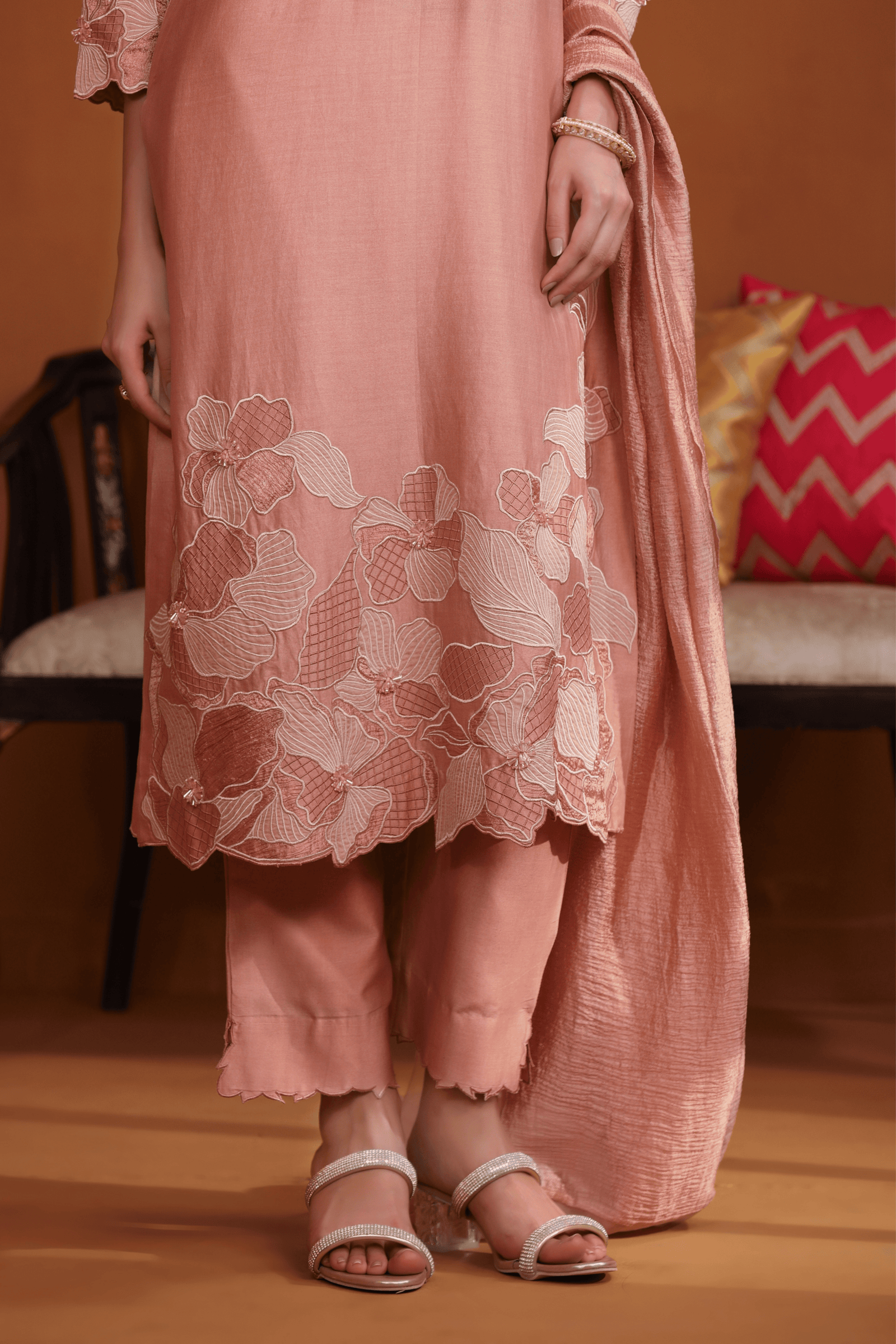 • Featuring our orange kurta set with fine embroidery combined with delicate applique patch work around the neck and bootas spread all over the kurta. The a-line flowy silhouette ensures comfort and ease paired with matching trousers and accessorized with a beautiful tonal crushed silk & organza dupatta with hangings.