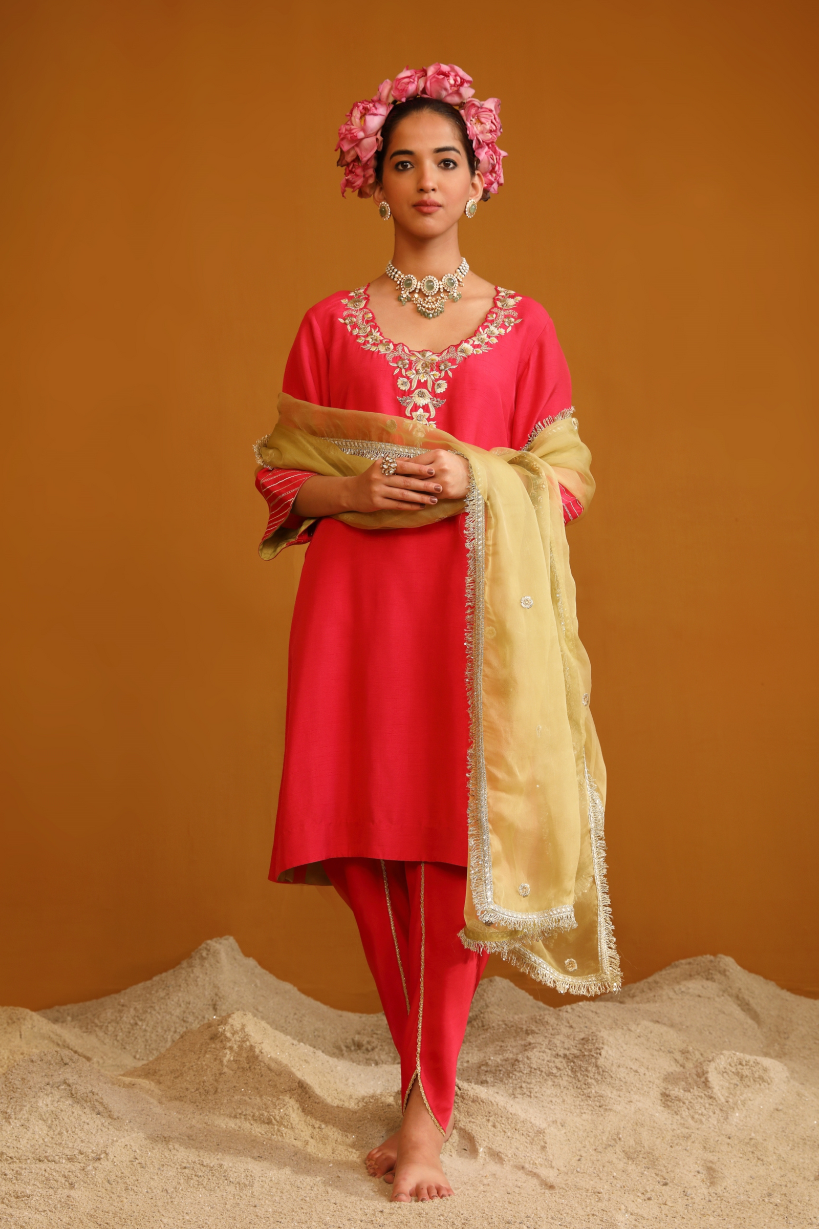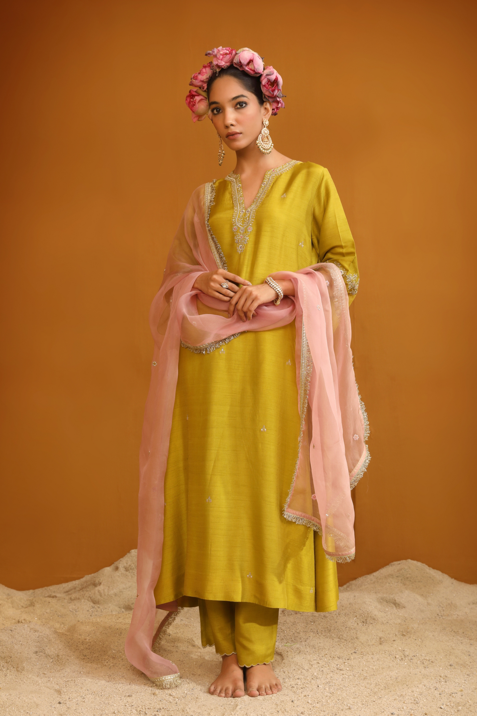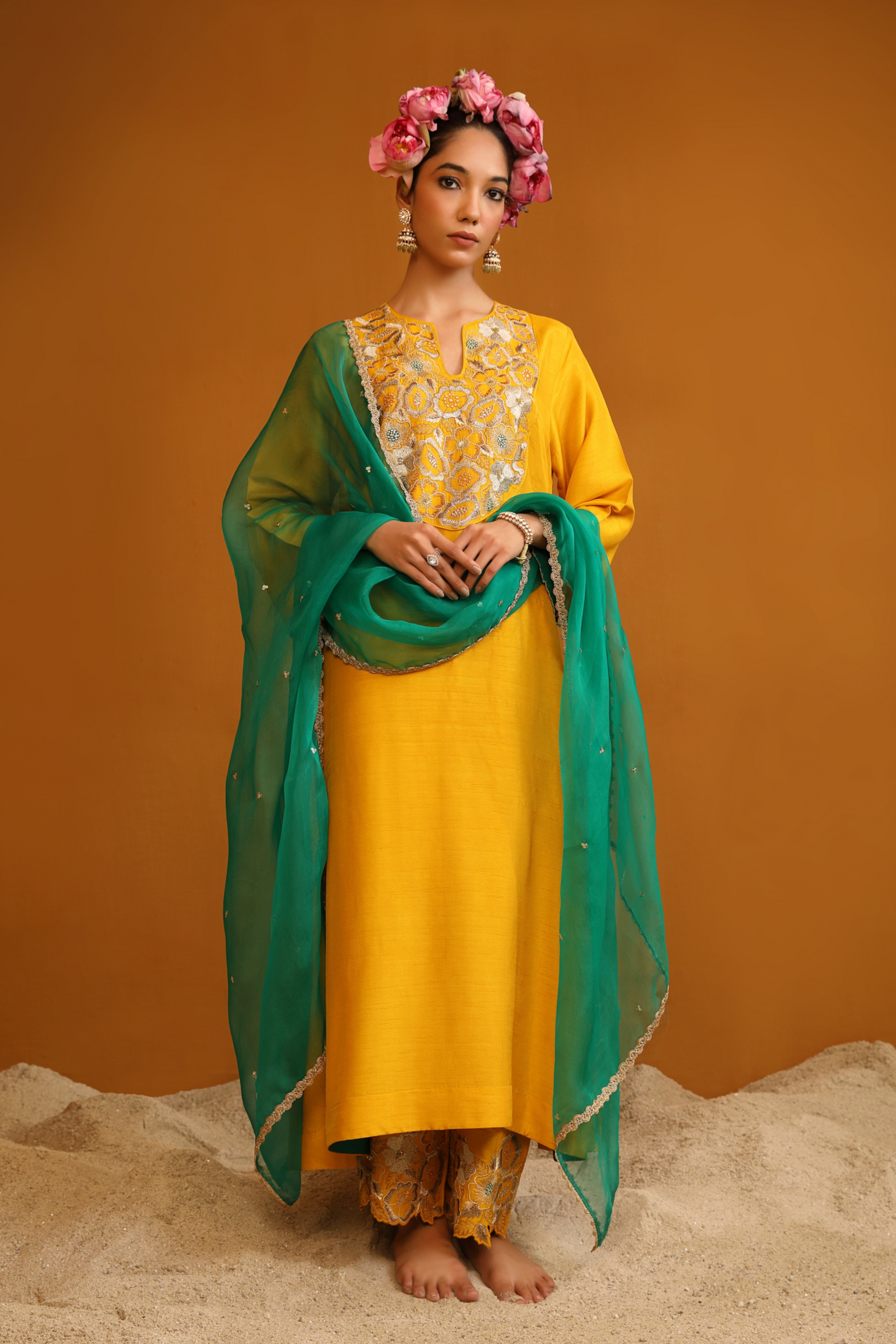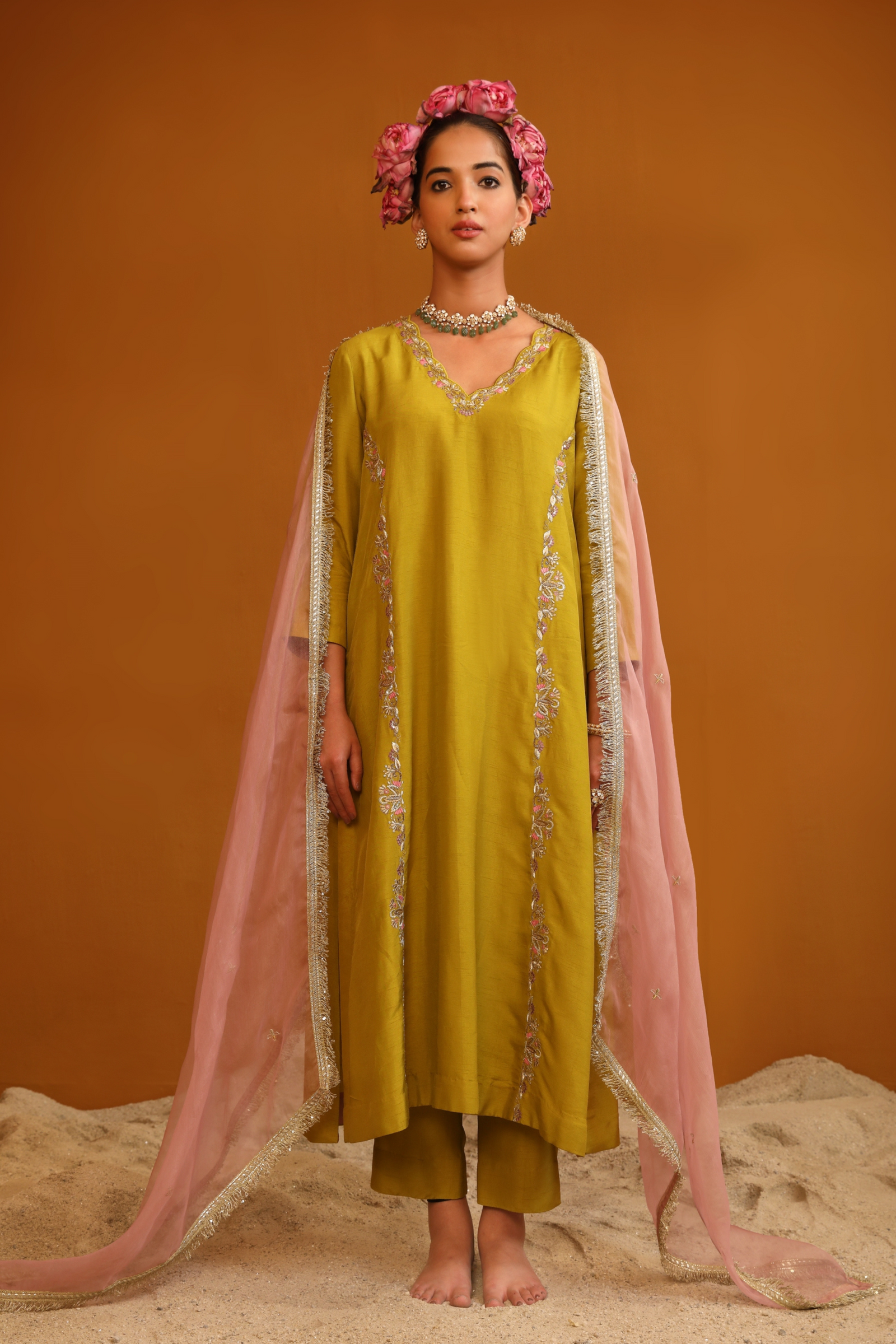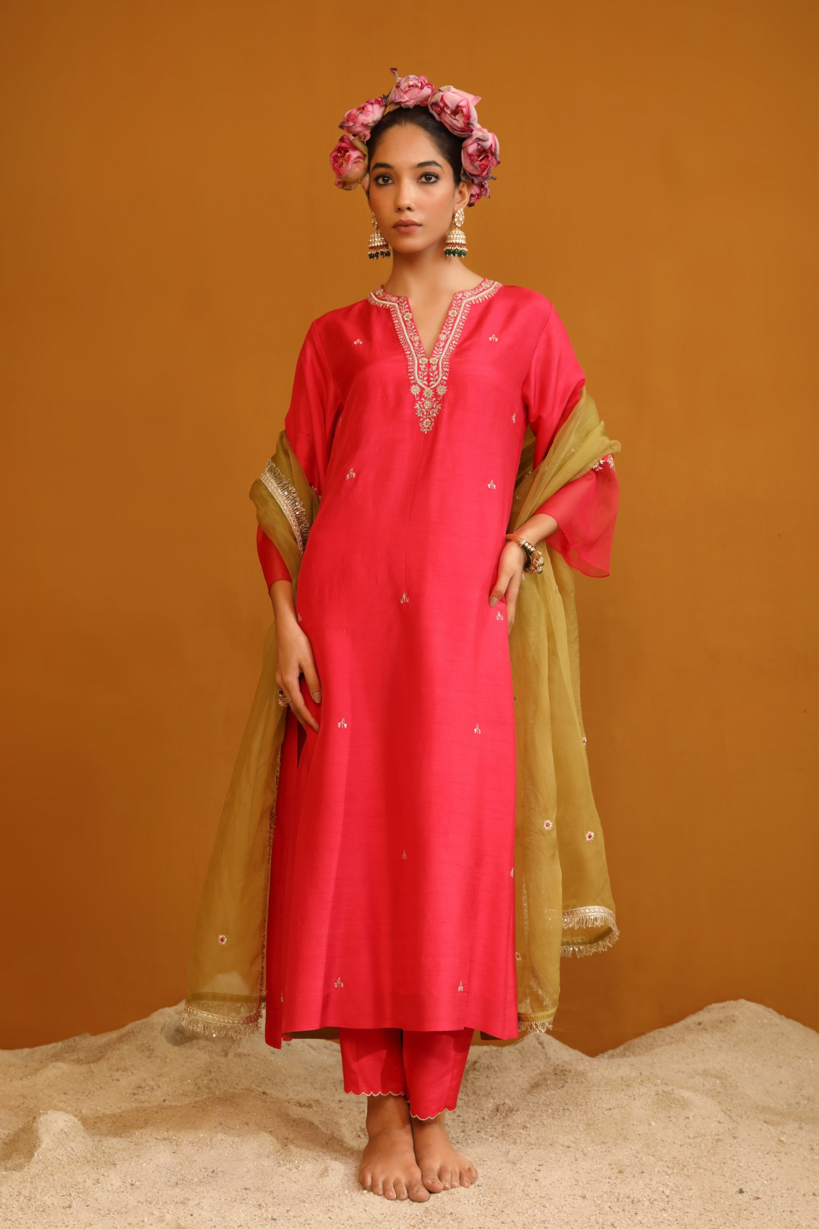 • Featuring our orange kurta set with fine embroidery combined with delicate applique patch work around the neck and bootas spread all over the kurta. The a-line flowy silhouette ensures comfort and ease paired with matching trousers and accessorized with a beautiful tonal crushed silk & organza dupatta with hangings.
