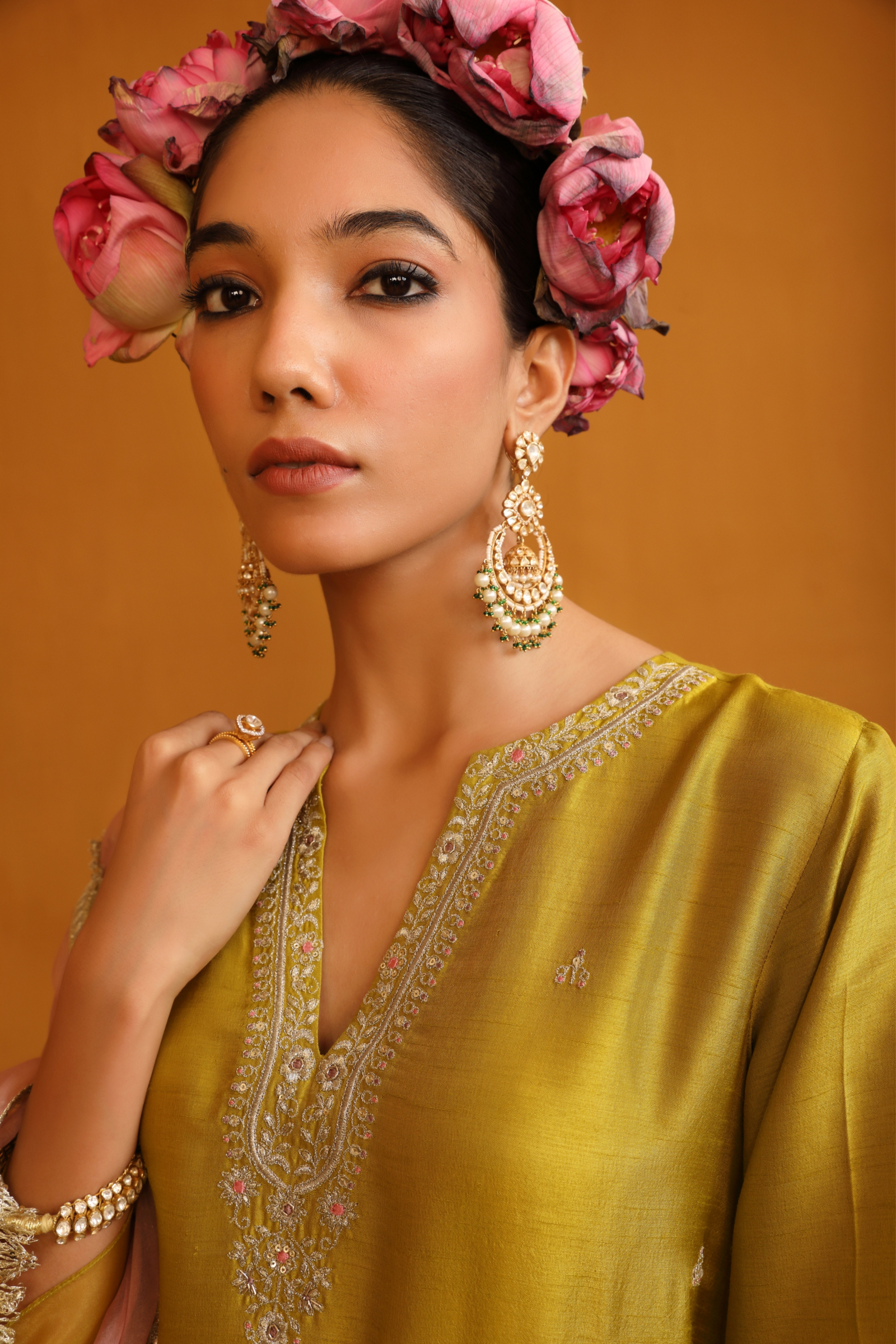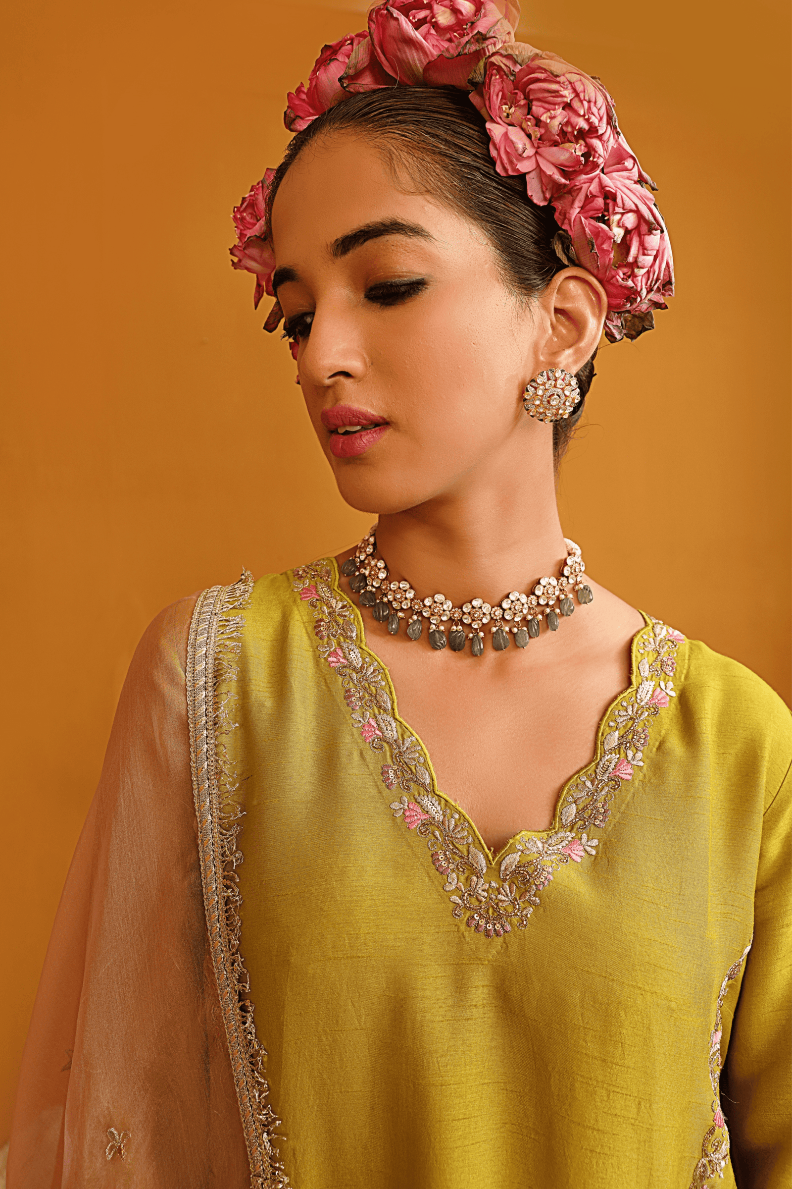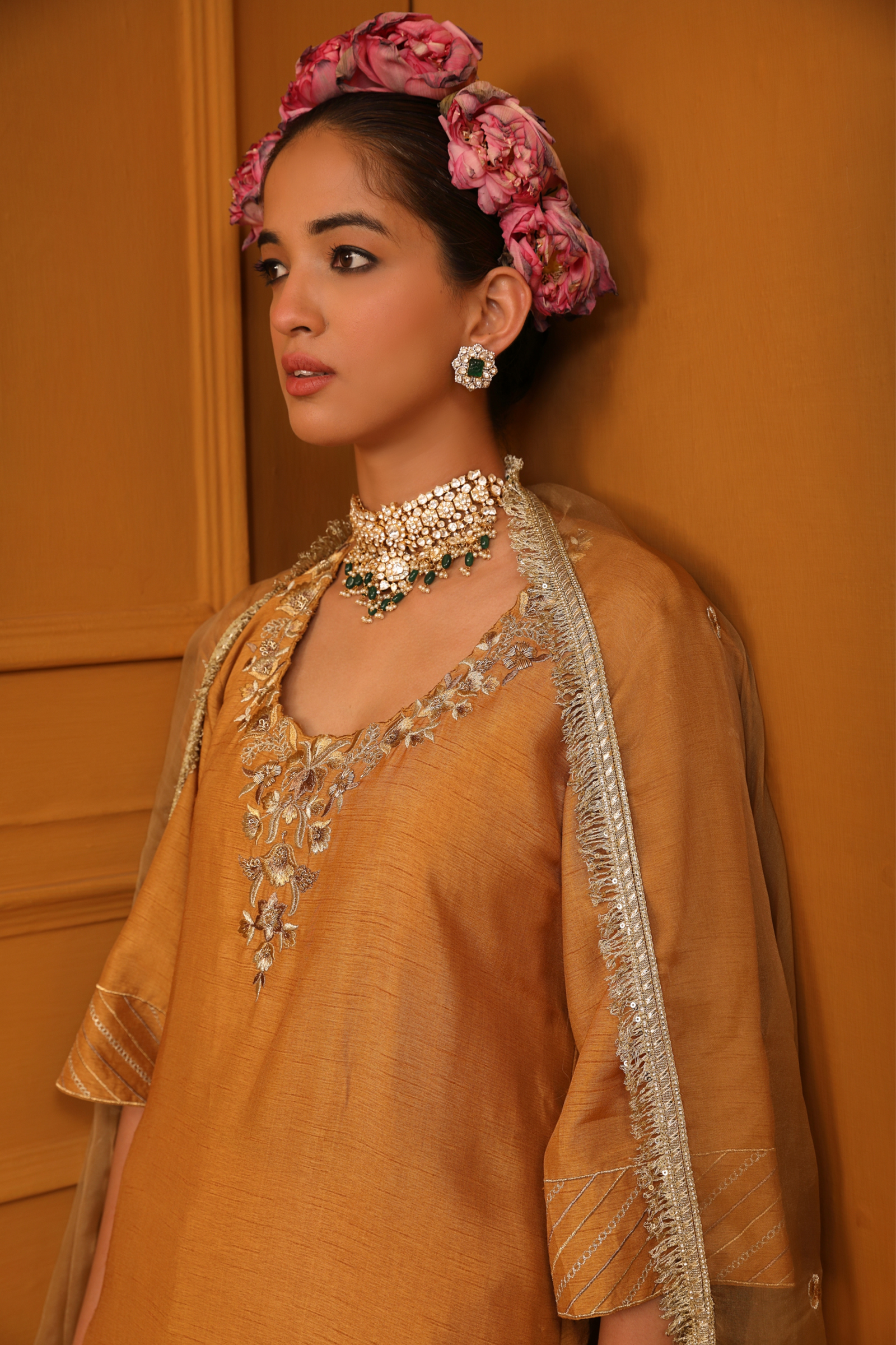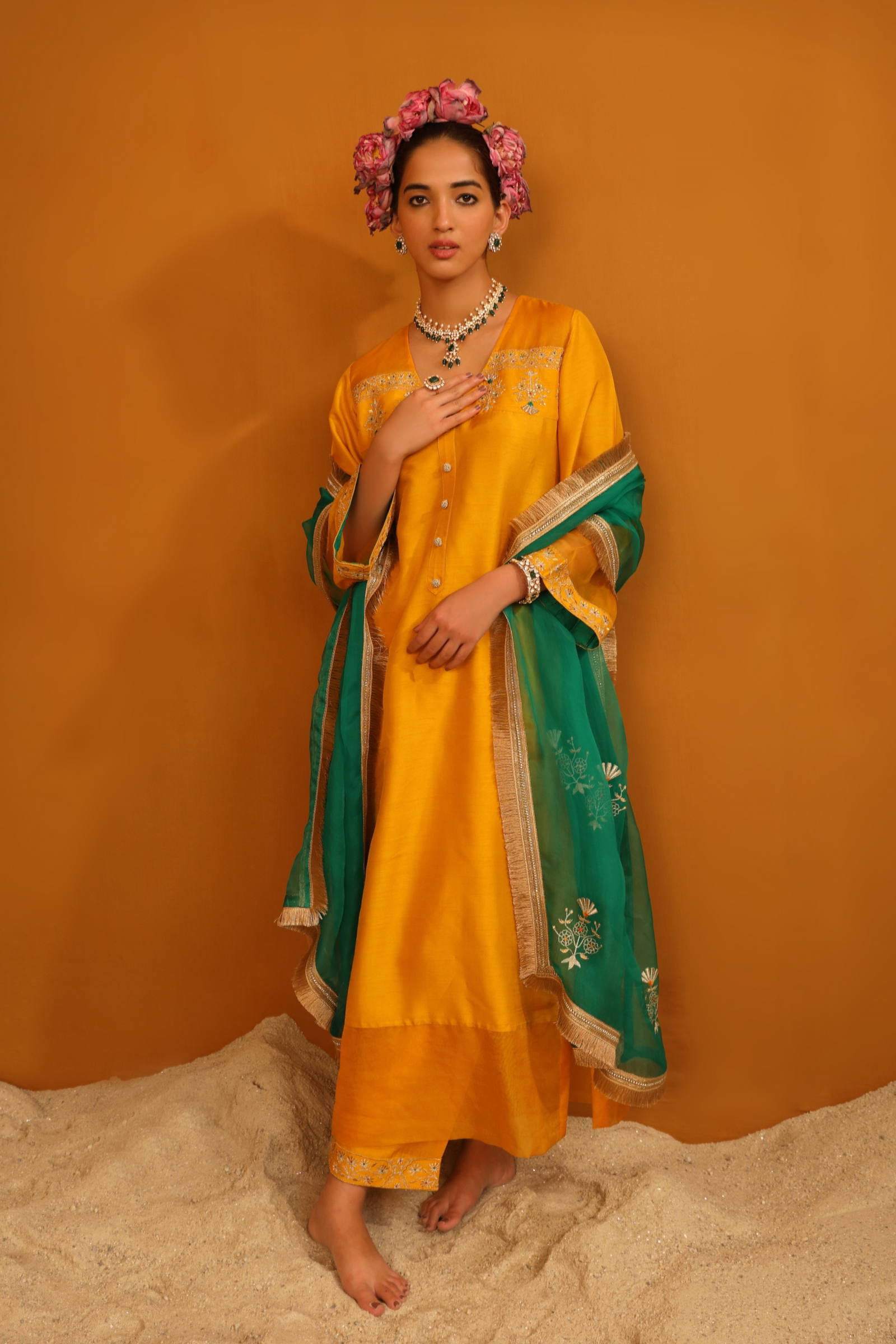 • Featuring our orange kurta set with fine embroidery combined with delicate applique patch work around the neck and bootas spread all over the kurta. The a-line flowy silhouette ensures comfort and ease paired with matching trousers and accessorized with a beautiful tonal crushed silk & organza dupatta with hangings.