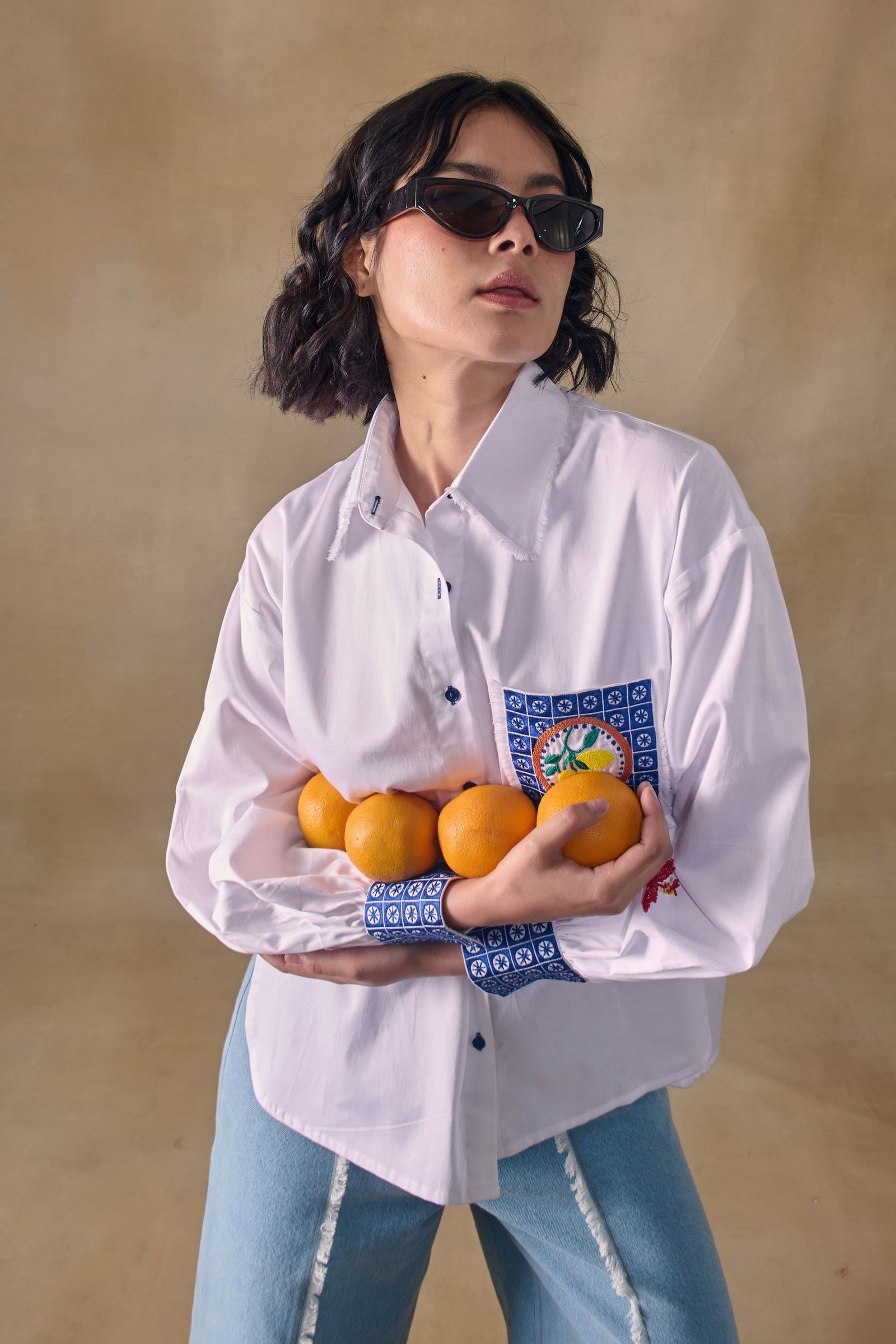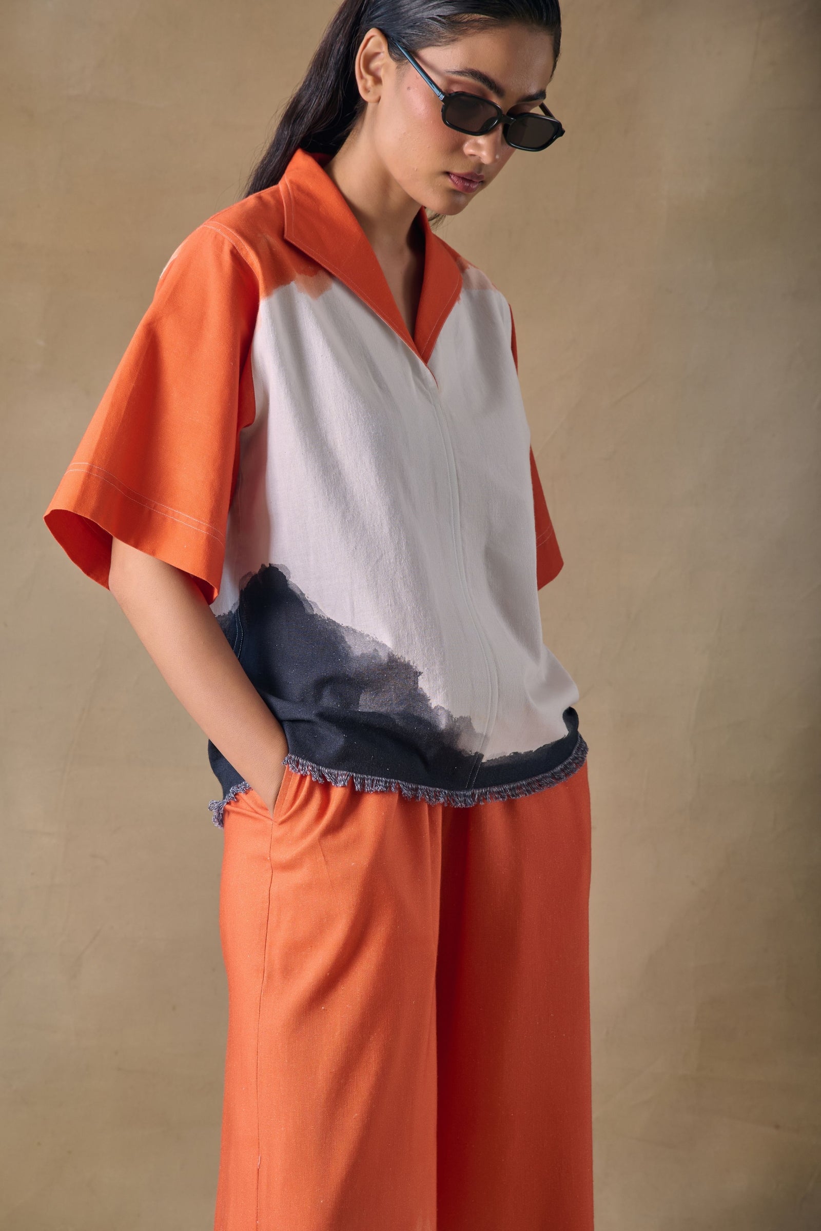 • Orange double breasted blazer featuring patchwork and threadwork embroidery.
