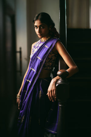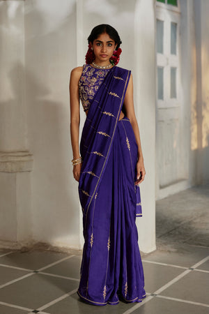 • A solid purple saree adorned with exquisite hand-embroidered lines and delicate floral accents, paired with a matching blouse fully embellished with aari and zardozi embroidery. The six-yard saree is finished with satin-facing for structure and elegance. The padded blouse is fitted at the bust and waist, comes with attached lining, and features a back hook-and-eye opening with drawstring. Completed with a fitted petticoat with a side drawstring opening, this ensemble is elevated with elegant hand-tucked tassel details, creating a sophisticated and artisanal look.