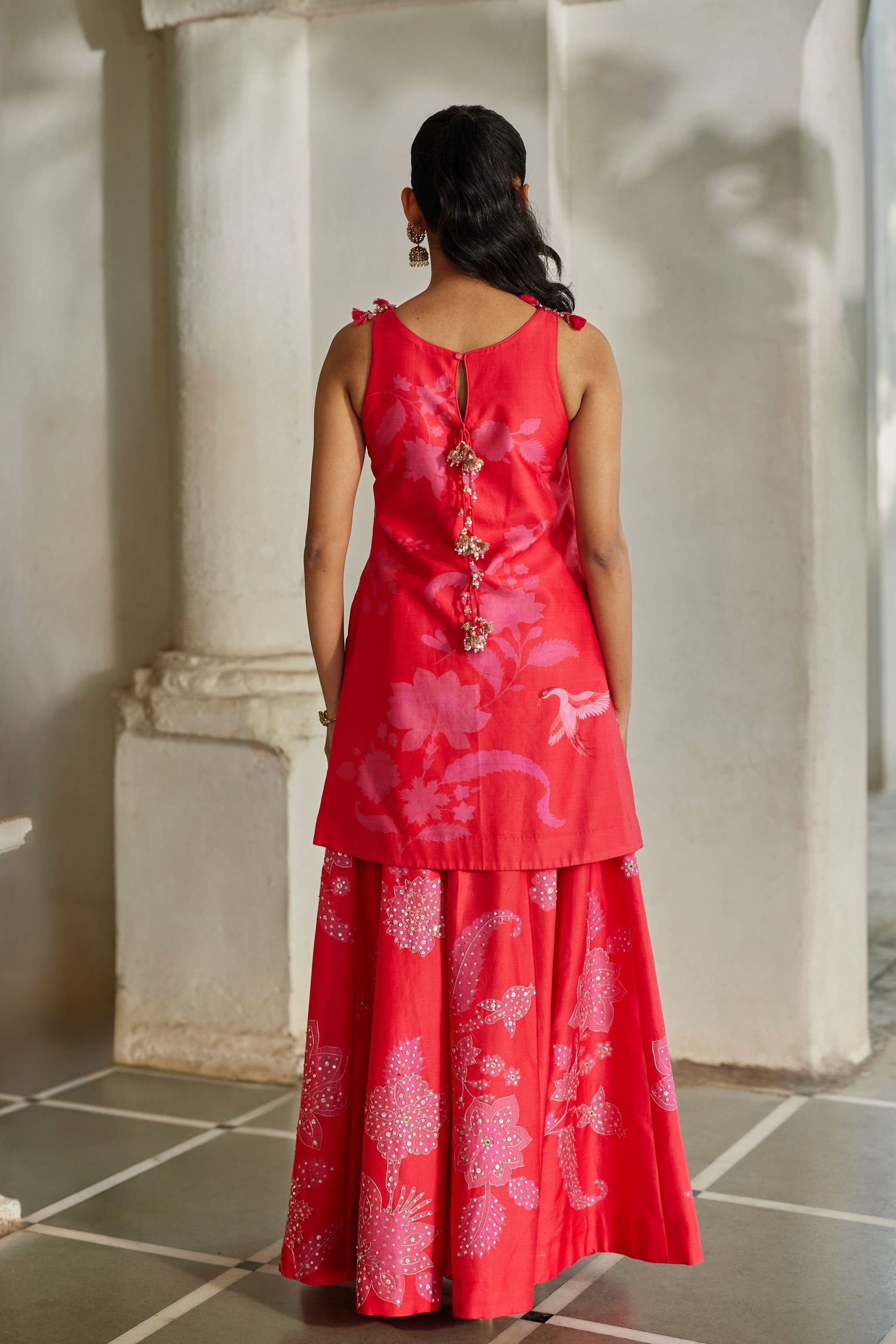 • Introducing a charming sharara set ensemble featuring a floral print kurta paired with a matching sharara. The kurta is fitted at the bust and waist, comes with attached lining, a back loop button opening, and tassel detailing on the straps, while the sharara is fitted at the waist with a front waistband and back elastic, attached lining, and a side zip opening. Subtle sequin-highlight embroidery and hand-tucked tassels on the shoulders add delicate detailing, blending effortless style with playful elegance- perfect for festive or casual occasions.