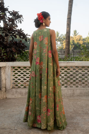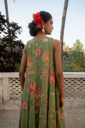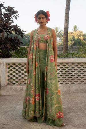 • A sage green jacket set crafted from beautiful orangza with scallop details, it is paired with a solid pre–draped skirt. This statement ensemble is crafted for modern day celebrations with its hand embroidered jacket and blouse is adorned using zardosi techniques.