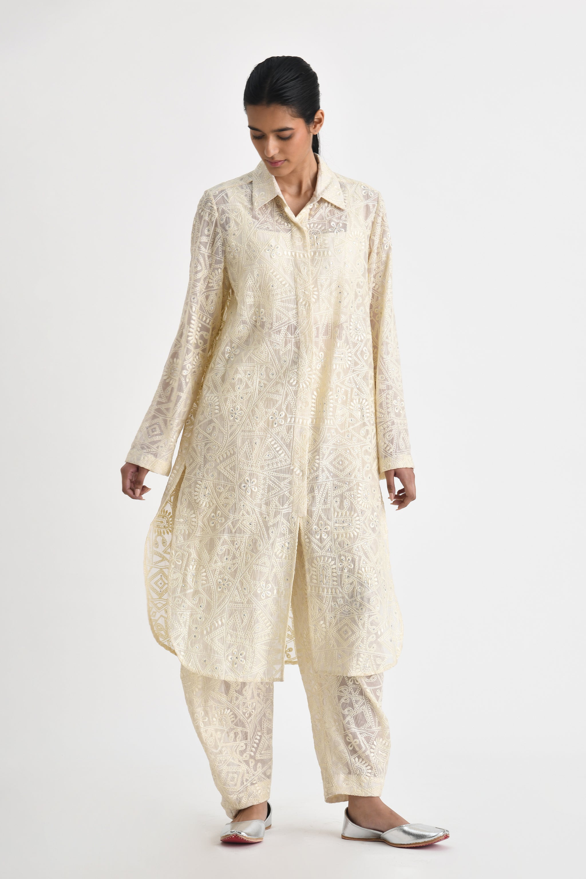 • Tonal embroidered cowl pants in geometric patchwork motifs. Style them with our matching tunic and get occassion ready.