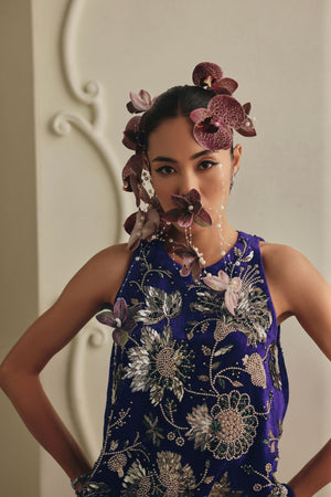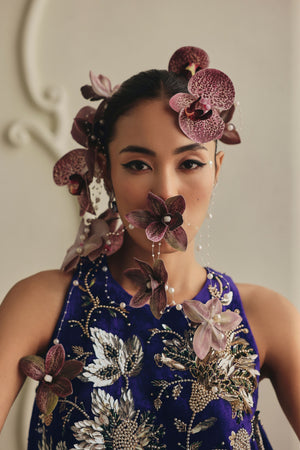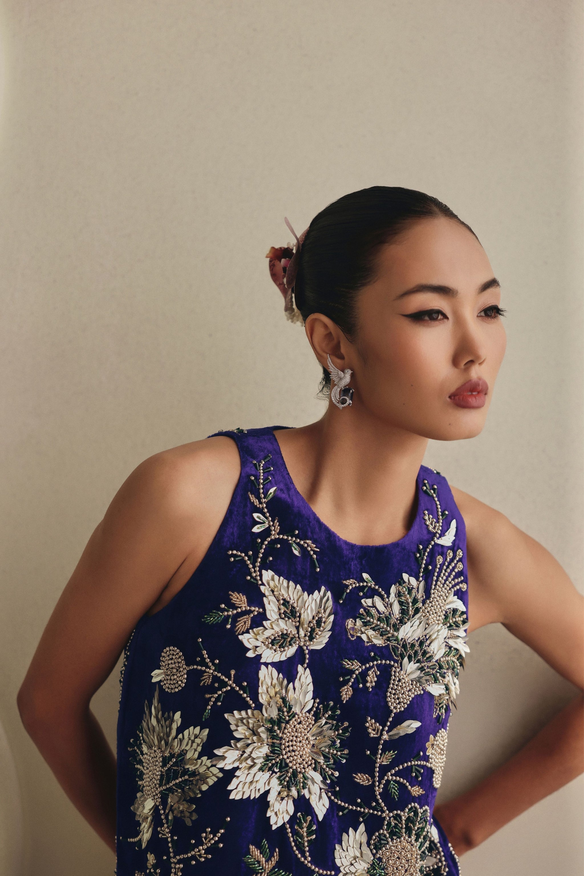 • Playful yet poised, this velvet mini dress features intricate 3d floral embellishments that bring texture and drama to the look. A statement piece that blends luxe craftsmanship with youthful charm - perfect for festive evenings that call for a touch of sparkle and individuality.